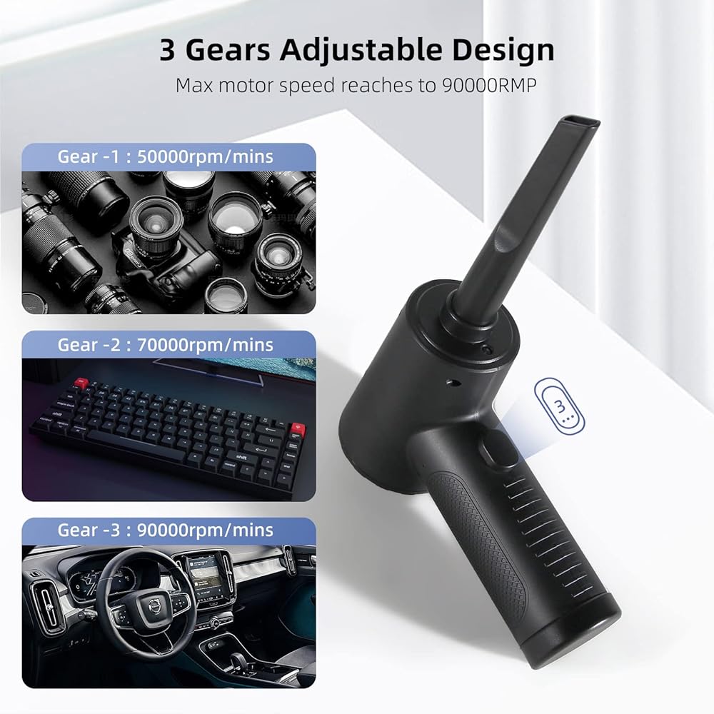 【إيقاف الغبار القوي - 3 سرعات للتروس】توفر منفضة الهواء القابلة لإعادة الشحن 3 سرعات تروس - 5000 و7000 و9000 دورة في الدقيقة لاحتياجات التنظيف المختلفة. لن يؤذي تدفق الهواء الثابت والنقي مقتنياتك الثمينة على الإطلاق. اضغط لفترة طويلة على المفتاح لمدة 3 ثوانٍ لتشغيل الجهاز وإيقافه. مفتاح ضغط قصير يمكن أن يتحول إلى ثلاث سرعات للرياح. هذا عملي وبسيط