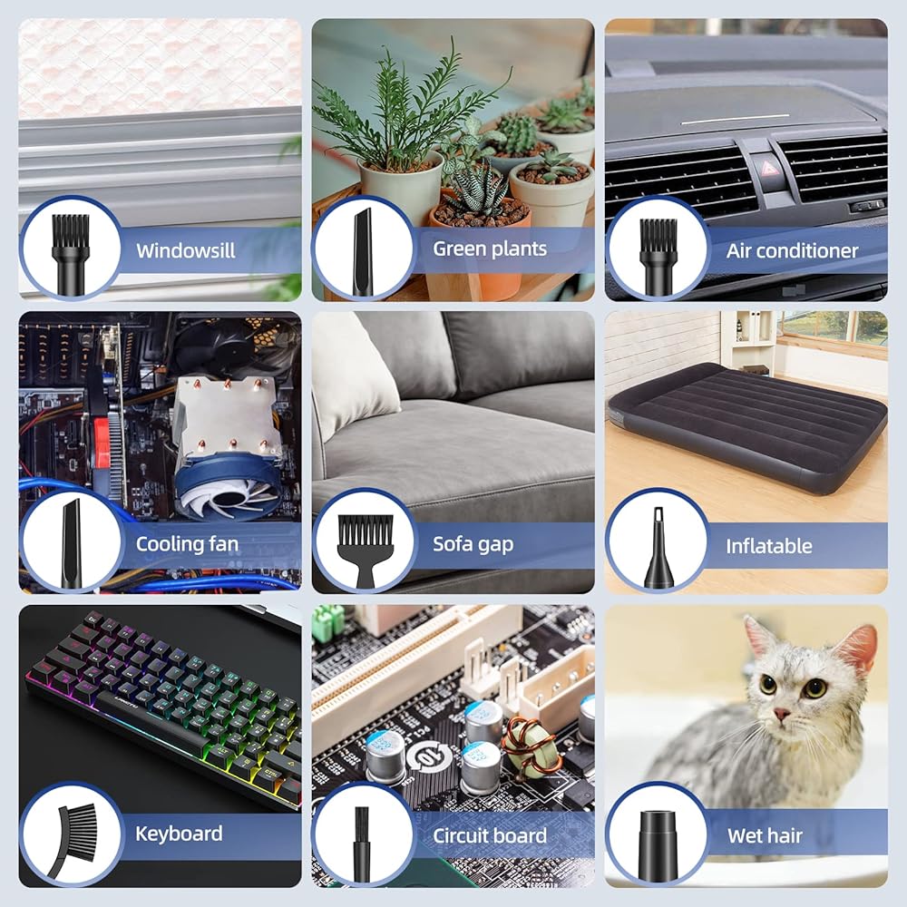 【تستخدم على نطاق واسع وسهلة الحمل】تأتي منفضة الهواء المضغوط مع 4 فوهات مختلفة و4 فرش لتنظيف الأشياء المختلفة. يمكن استخدام منفضة الغبار الكهربائية الخاصة بنا للكمبيوتر والكيبورد والكاميرا والأريكة والنوافذ والنباتات وشعر الحيوانات الأليفة والأجهزة الإلكترونية الأخرى. مناسبة جدًا للتنظيف العميق للمنازل والمكاتب والديكورات الداخلية للسيارة.