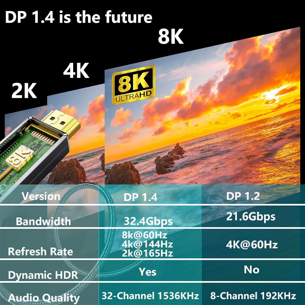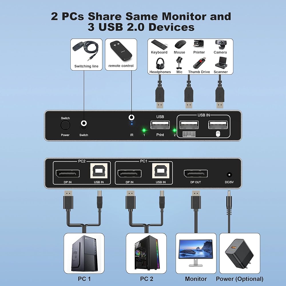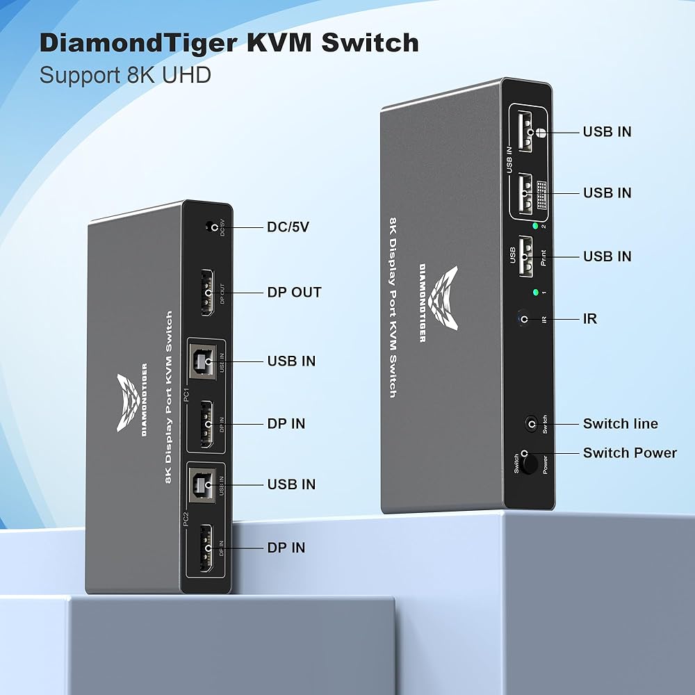 8K DisplayPort KVM Switch - KVM Switch Displayport هو مفتاح DP 1.4 يساعدك على مشاركة شاشة واحدة و3 أجهزة USB 2.0، مثل الماسح الضوئي والطابعة والماوس ولوحة المفاتيح، بين جهازي كمبيوتر. استخدم مجموعة واحدة من أجهزة الإدخال وشاشة واحدة بدقة 8 كيلو عند 60 هرتز و4 كيلو عند 144 هرتز و2 كيلو عند 165 هرتز لجهازي كمبيوتر. قلل تكاليف الأجهزة، وحافظ على نظافته وفعاليته، وحافظ على سطح مكتبك نظيفًا ومرتبًا. يعد DP 1.4 حاليًا أعلى الأجهزة القياسية، وهو متوافق مع جميع الأجهزة مثل DP 1.2 وDP 1.0