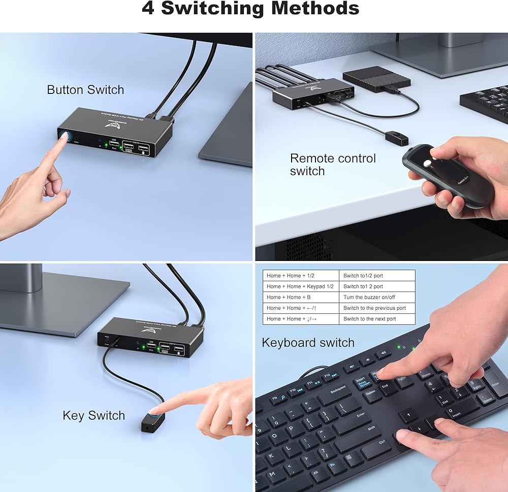 8 كيلو عند 60 هرتز - يدعم مفتاح DP 1.4 KVM هذا لجهازي كمبيوتر دقة تصل إلى 8 كيلو عند 60 هرتز (7680 × 4320 عند 60 هرتز) ومتوافق مع الإصدارات السابقة بدقة أقل. استمتع بالمحتوى دون فقدان الجودة العالية للألوان والفيديو والصوت