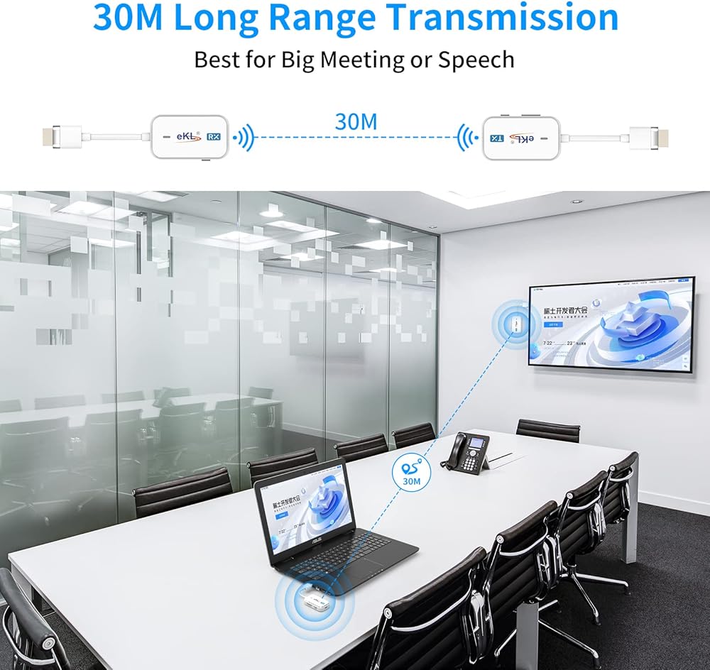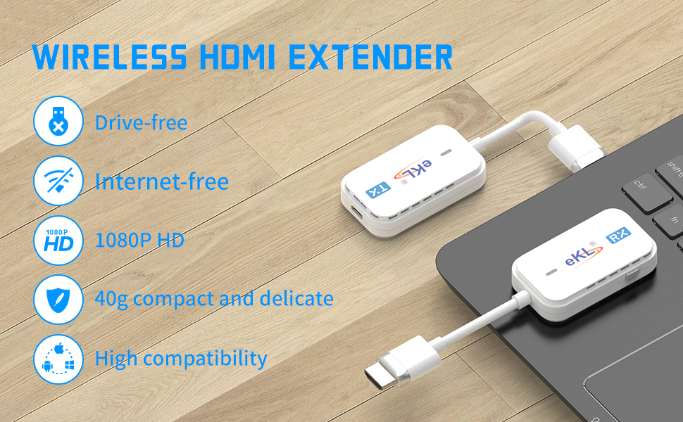 موسع HDMI اللاسلكي eKL 1080P@60 هرتز 98 قدمًا/30 مترًا يدعم 5 جيجا هرتز لبث صوت الفيديو من الكمبيوتر المحمول والكاميرا وصندوق الكابل وNetflix وPS5 إلى جهاز العرض وتوصيل HDTV وتشغيل بدون سائق