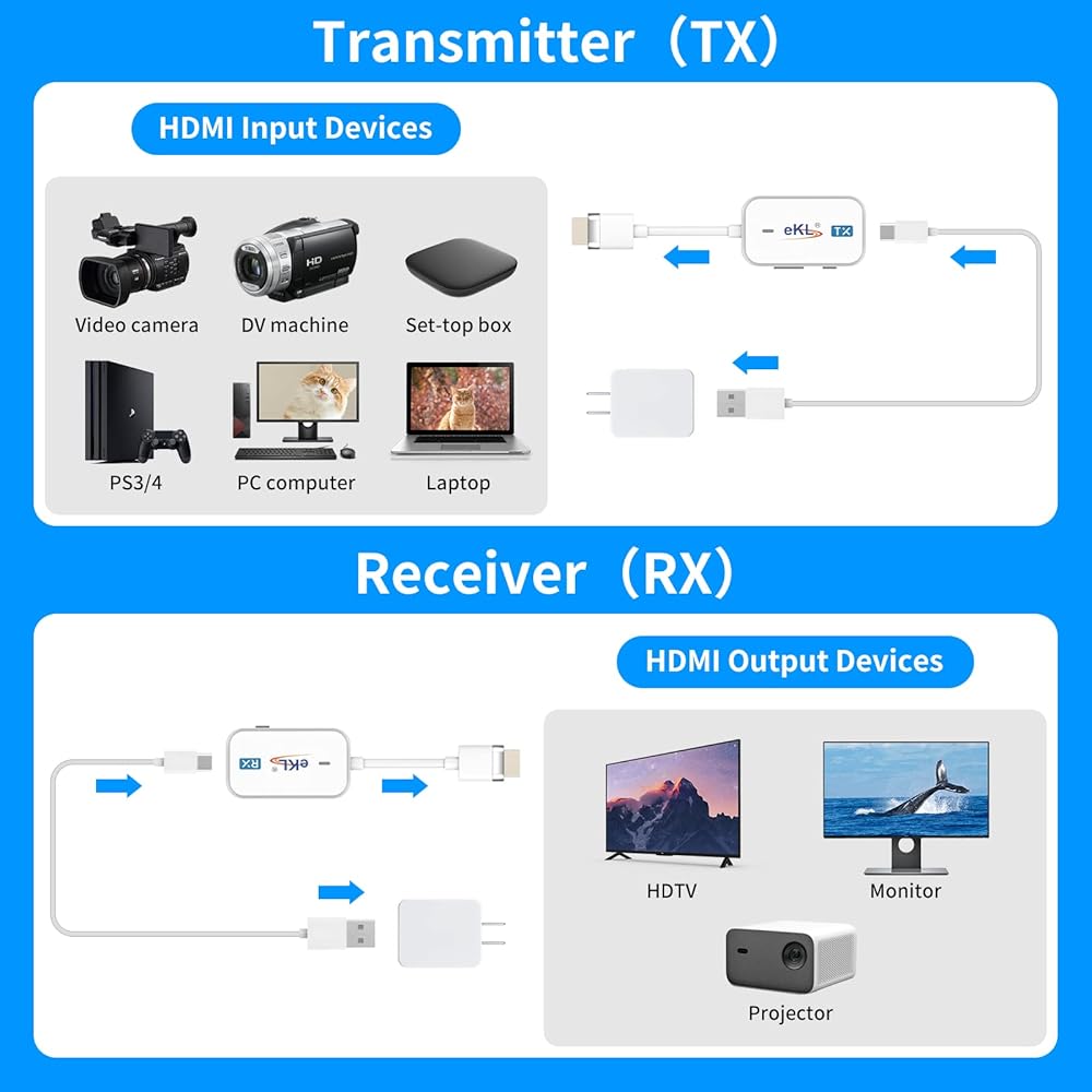【توافق واسع】مجموعة HDMI اللاسلكية هذه خفيفة الوزن وسهلة الحمل لعرض الأعمال في الهواء الطلق. متوافق مع معظم أجهزة إخراج HDMI والكمبيوتر المحمول والكمبيوتر الشخصي ومشغل بلو راي والكاميرا وأقراص DVD وDSLR وصناديق الاستقبال وصناديق الكابلات/الأقمار الصناعية والكمبيوتر اللوحي والمزيد. مناسبة لقاعات المؤتمرات والترفيه المنزلي وتعليم الوسائط المتعددة.