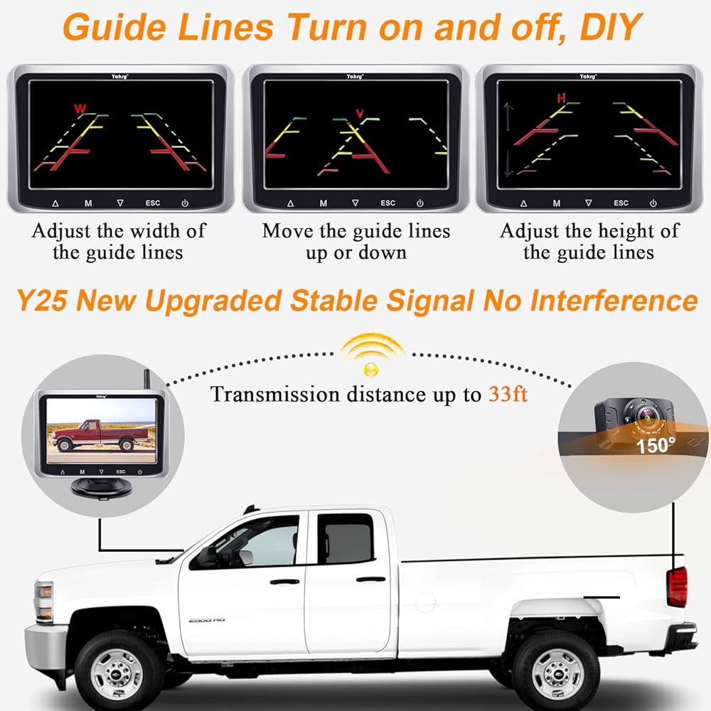 ►【كاميرا مقاومة للماء وزاوية عريضة 150 درجة】كاميرا احتياطية لاسلكية لكاميرا نظام السيارة مع زاوية رؤية مقاومة للماء IP69K بزاوية 150 درجة. اجعل كل شيء آمنًا. يمكن إخفاء دعامة الكاميرا الخاصة بالمقطورة خلف لوحة الترخيص. خطوط التوجيهات يمكن أن تكون DIY.