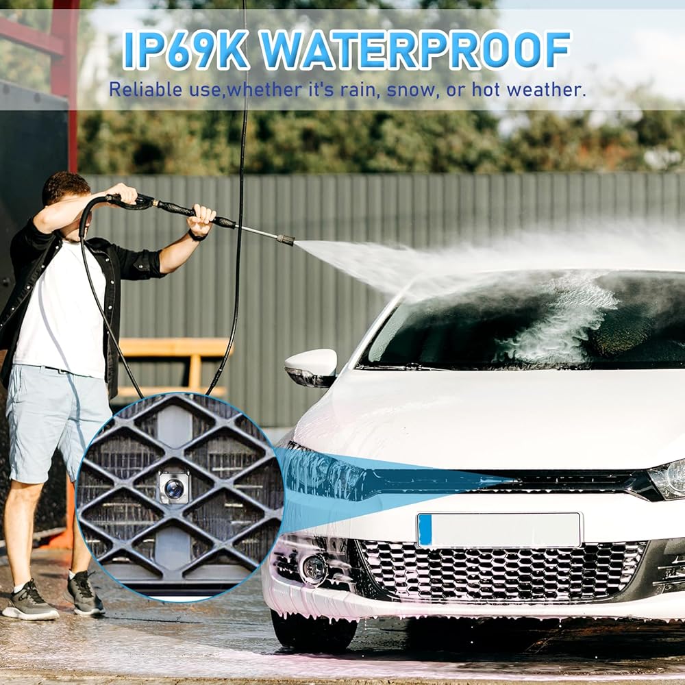 • IP69K مقاومة للماء: الكاميرا الاحتياطية مصنوعة من هيكل معدني كامل قوي (يشمل الكاميرا الاحتياطية وحامل الدعامة)، أحدث عملية تعبئة غراء نانو مقاومة للماء، ستمنع بشكل فعال دخول الماء أو الضباب أو الرذاذ إلى الكاميرا. سيكون الغلاف المعدني أيضًا أكثر متانة من الغلاف البلاستيكي.