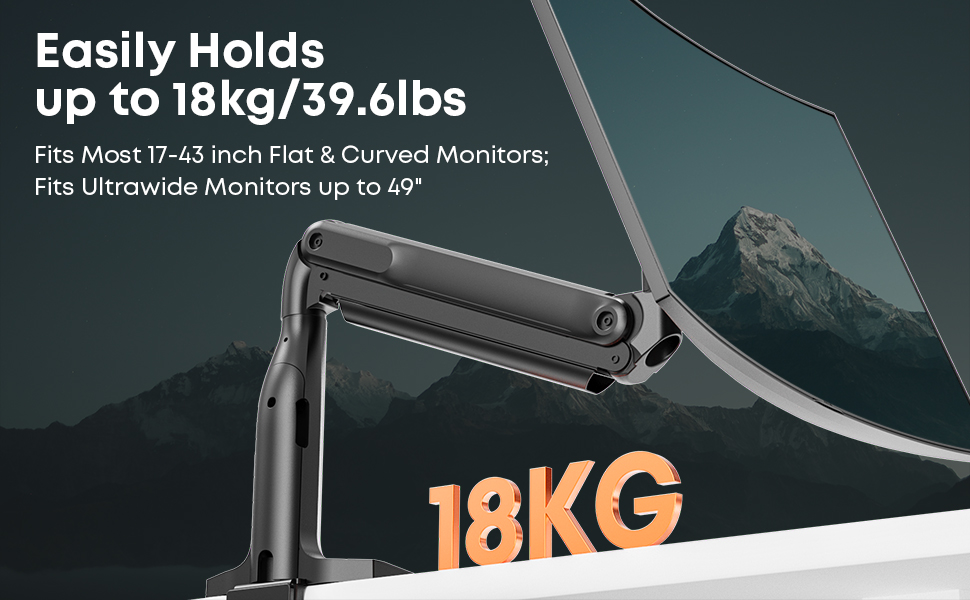 • زنبرك غاز شديد التحمل: حامل شاشة واحد يحمل وزن يصل إلى 39.6 باوند/18 كجم. يمكن أن يدعم بسهولة معظم الشاشات في السوق.