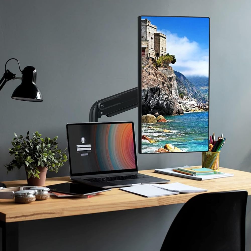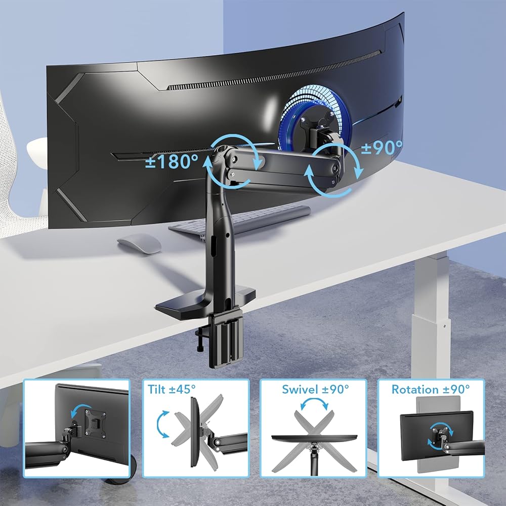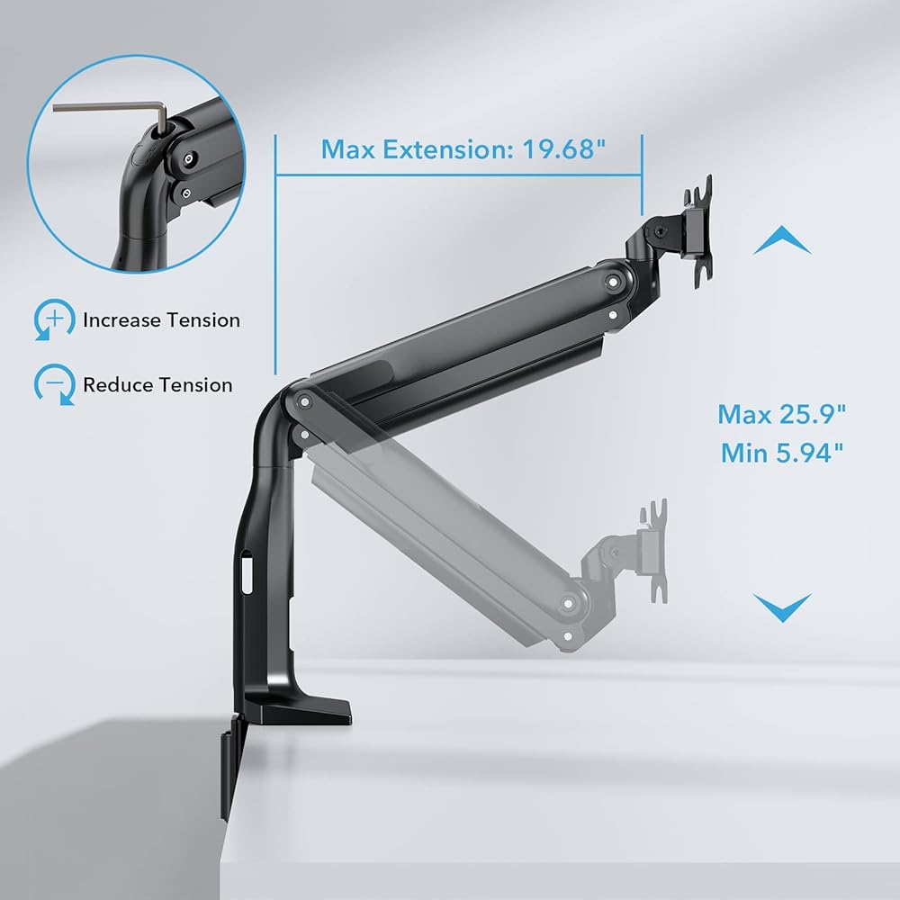 • ذراع قابل للتعديل بالكامل: يمكن تمديد ذراع الشاشة حتى 19.7 انش، وتعديل الارتفاع من 5.9 انش إلى 25.9 انش، يوفر إمالة +/-45 درجة، دوران +/-90 درجة، دوران +/-90 درجة لضبط الزاوية المثلى. تحسين الكفاءة مع حماية صحتك.