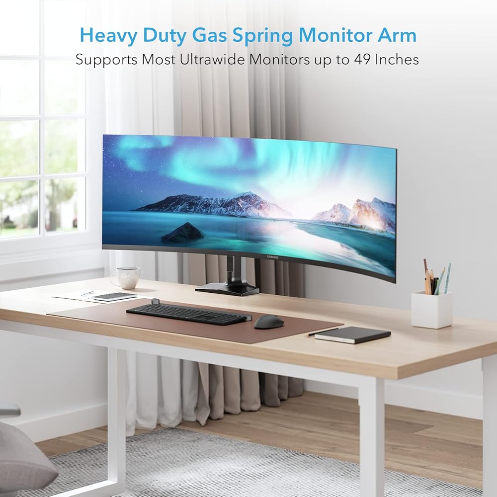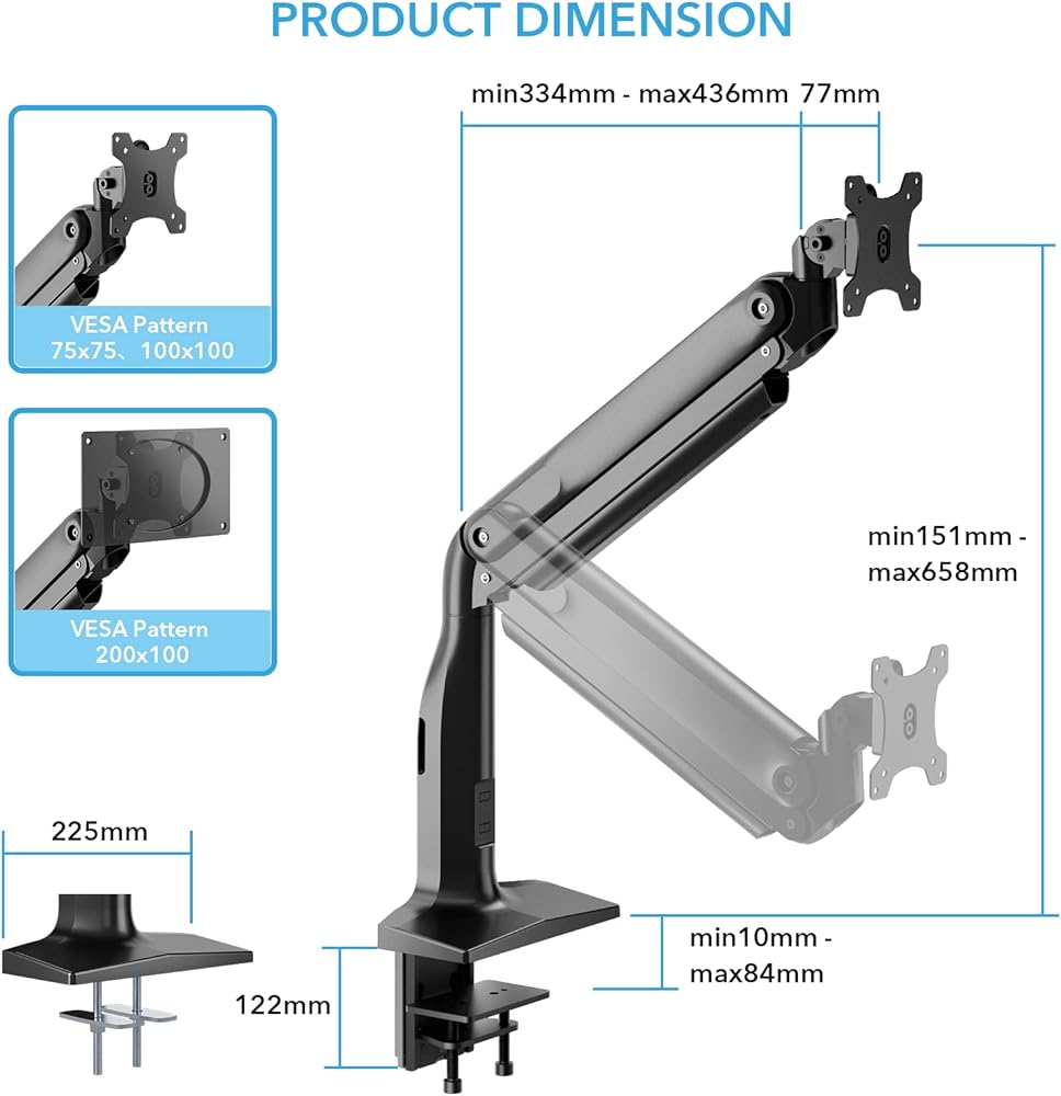 ذراع شاشة فردي فائق الاتساع، ذراع شاشة شديد التحمل لشاشات مسطحة ومنحنية مقاس 17-43 انش، يتحمل حتى 40 باوند، حامل مكتب الومنيوم بنابض غاز مع حد اقصى فيسا 200×100، اسود