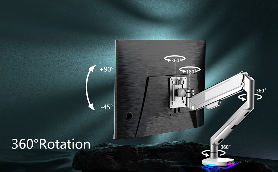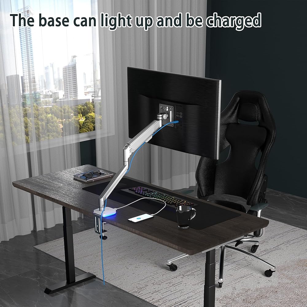 【SPECIAL BASE】: The base can not only light but also charge. Convenient and simple. Support both C-Clamp and Grommet mounting. This is superior to any other single arm monitor mount on the market.