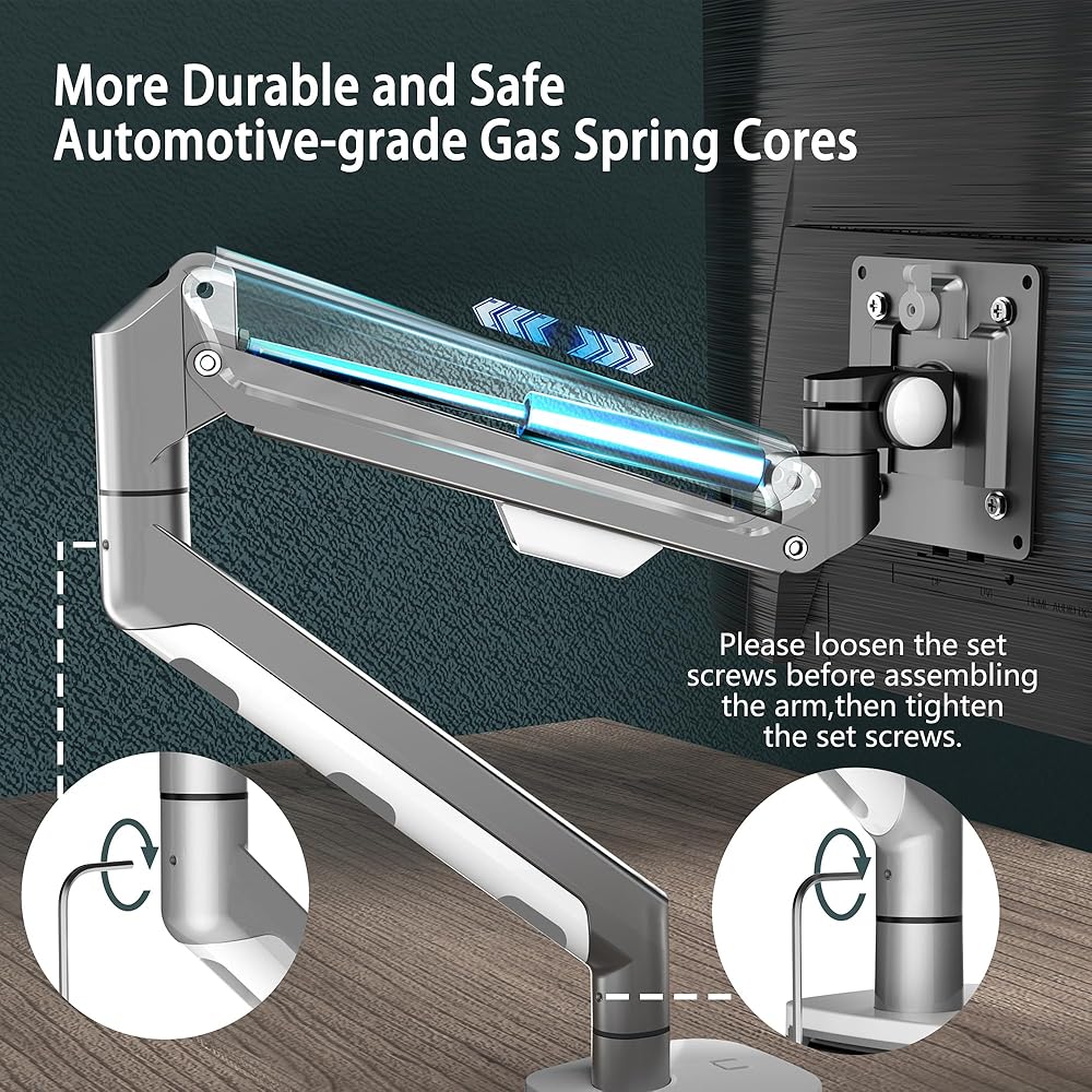 【DESIGNED FOR HEAVY MONITORS】: Gas spring monitor arms are made from high-quality materials. Its silver exterior design is not only visually appealing but also reinforces its impressive weight-bearing capacity, max load capacity can reach 26.4lbs.