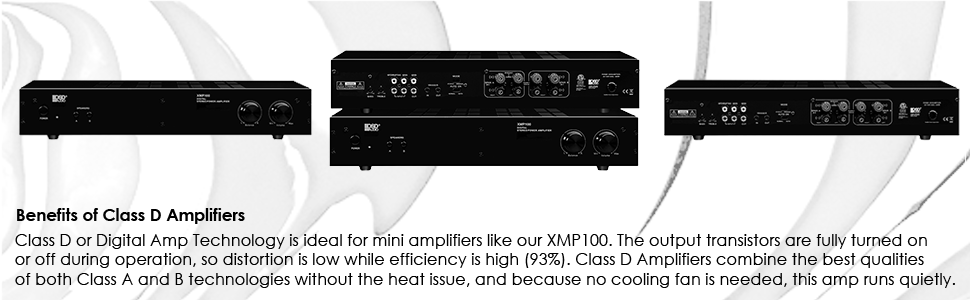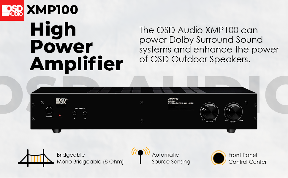 XMP100 هو الإصدار الرقمي من الفئة D من مضخم الصوت ايه ام بي 120 الشهير. سيعمل هذا مكبر الصوت على تشغيل أنظمة الصوت المحيطي دولبي ويعزز قوة مكبرات الصوت الخارجية OSD. يتيح التبديل التلقائي للمصدر للمستخدمين توصيل أكثر من مصدر بمضخم الصوت، لذلك، على سبيل المثال، يمكنك استخدامه لتشغيل كل من مشغل دي في دي وايبود. يتمتع XMP100 بالقدرة على تبديل المصادر تلقائيًا، وكذلك إذا اخترت الانتقال من الاستماع إلى الموسيقى على جهاز الايبود الخاص بك إلى مشاهدة نقرة على مشغل دي في دي. يحتوي مضخم الطاقة على 75 واط ار ام اس لكل قناة ومخرجات قابلة للتوصيل بقوة 160 واط ار ام اس. يلزم إدخال 1.4 فولت للوصول إلى الإخراج الكامل ونسبة الإشارة إلى الضوضاء 107 ديسيبل (وزن ايه). يحتوي مكبر الصوت الستيريو ثنائي المصدر بقناتين OSD-AMP120 على مقابض صوت وتوازن مثبتة على اللوحة الأمامية ويأتي مع عامين. توصيل هاتفك الذكي / جهاز الموسيقى المحمول سهل! الميزة الرائعة لجهاز XMP100 هي القدرة على توصيل هاتفك الذكي أو ايبود أو أي جهاز موسيقى محمول آخر. يتضمن XMP100 مدخلين لمستوى إشارة ار سي ايه تم وضع علامة باللون الأحمر لليمين والأبيض لليسار. كل ما عليك فعله هو شراء كيبل ار سي ايه إلى ميني غير المكلف (انظر كابلات الصوت ار سي ايه تحت علامة تبويب كابلات الصوت/الفيديو). يتم توصيل الموصل الصغير 3.5 بمخرج سماعة الرأس لجهازك ثم يتم توصيل RCAs بأحد مدخلات XMP100. الأمر بهذه السهولة! هل لديك جهاز ذكي مثل الأبناء؟ لا مشكلة. المواصفات: • نوع التصميم: فئة ذروة الطاقة الناتجة: 75 واط ار ام اس لكل قناة ومخرجات قابلة للتوصيل لقوة خرج ستيريو 160 واط 8 أوم عند 1% THD+N: 50W • أقصى طاقة خرج ستيريو 4 أوم عند 1% THD+N: 75W • الحد الأقصى 8 أوم مخرج أحادي عند 1% THD+N: 160W • التردد الرد: 1: 1. إجاب0 هرتز ~ 30 كيلو هرتز، -2 ديسيبل/+1 ديسيبل • المقاومة: 8 أوم إلى 4 أوم ثابت نسبة الإشارة إلى الضوضاء: 100 ديسيبل أقل من 50 واط إلى 8 أوم w20kHz مرشح تمرير منخفض استشعار الإشارة: تشغيل التشغيل ووضع الزناد مصدر تلقائي (معالجة الإشارات الرقمية): لا توجد أطراف إدخال وإخراج: إدخال خط المقاطعة، الإدخال/الإخراج الرئيسي، مشغل 12 فولت، مكبر صوت منطقة الإخراج ، منطقة مكبر الصوت منطقة رف إخراج B قابل للتركيب؟ نعم، تتضمن آذان حامل الرف الأبعاد (العرض × الارتفاع × العمق): 16.5 انش × 2.17 انش × 7.65 انش • الوزن: 4.5 باوند. • : سنتان