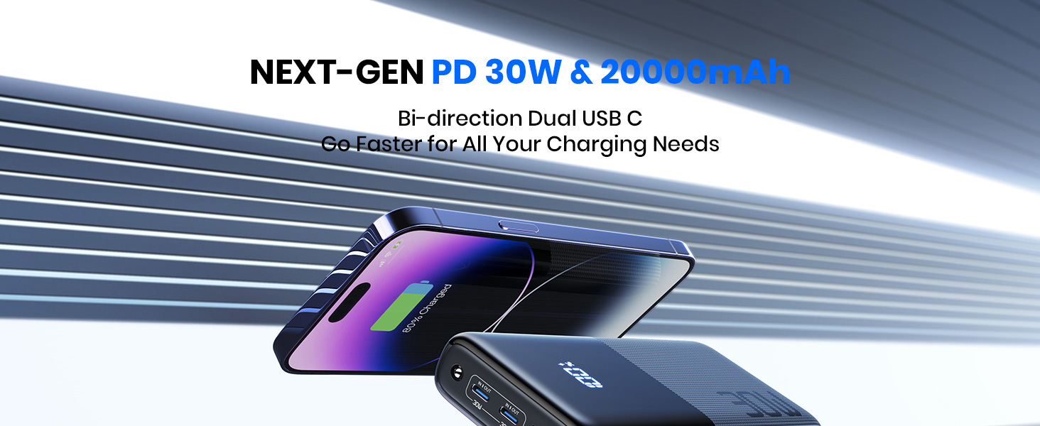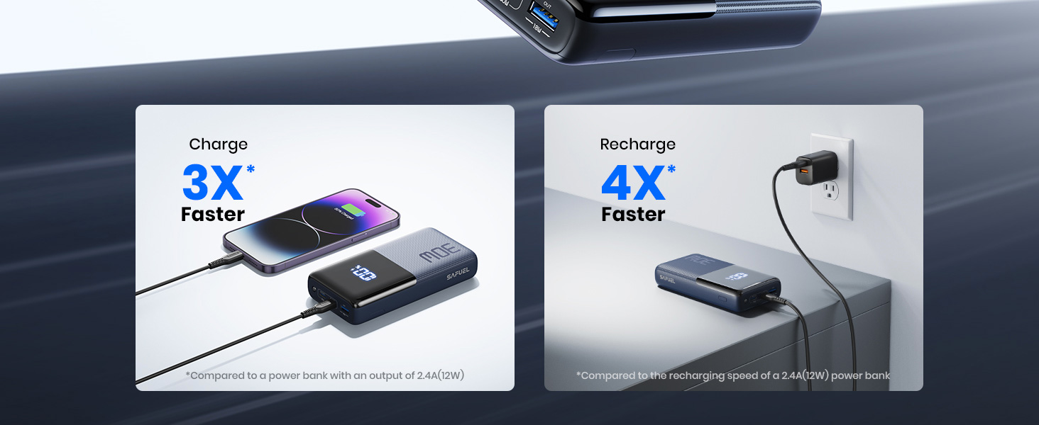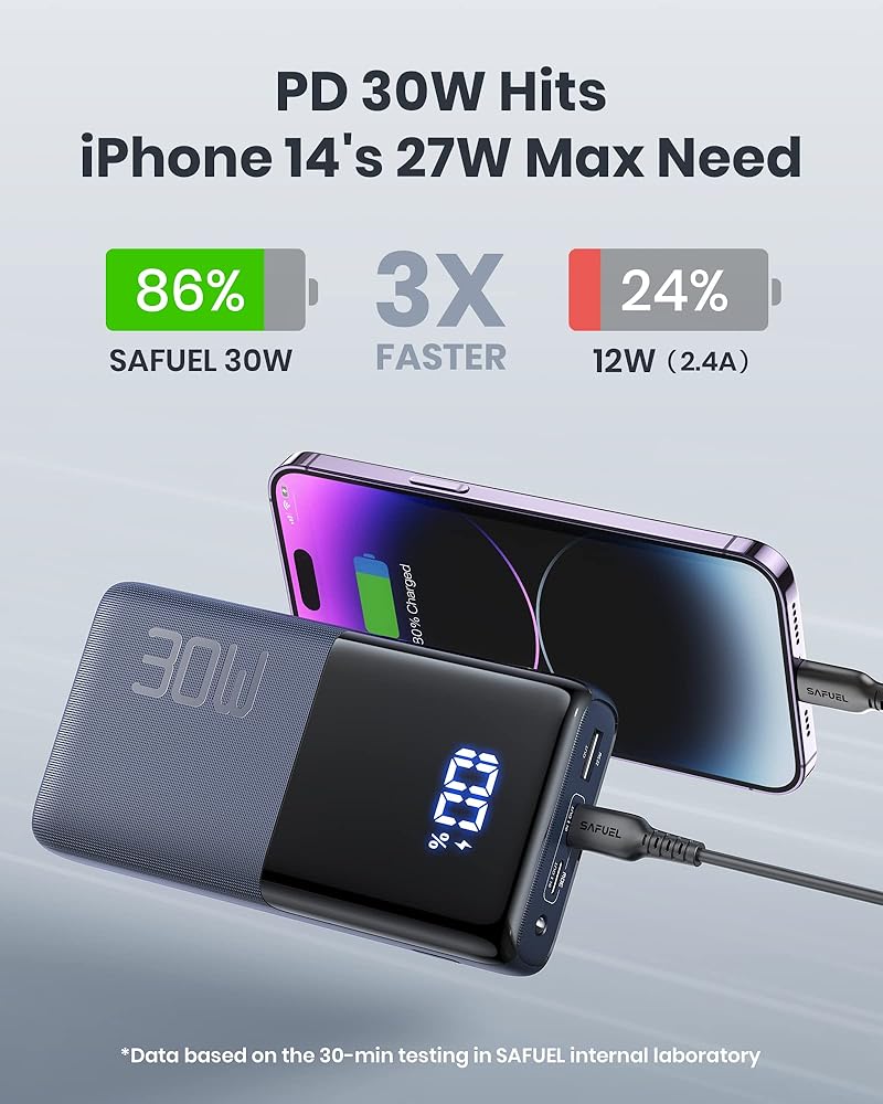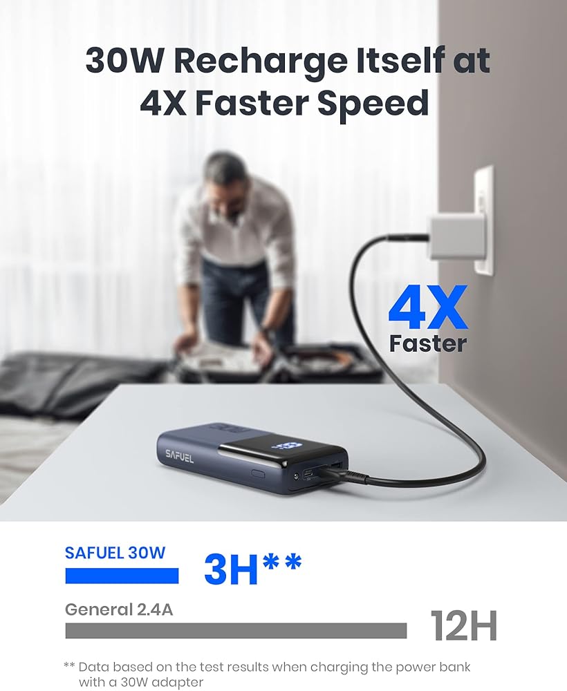 ✅【PD 30W يجعل إعادة الشحن أسرع 4 مرات】 بفضل اتجاه PD 30W USB C الداخلي والخارجي ثنائي الاتجاه، فإن SAFUEL يجعلها أسرع في الشحن وإعادة الشحن؛ يتم إعادة الشحن بنسبة 100% خلال 3 ساعات فقط، بينما يضيع الشاحن المحمول الآخر بقوة 2.4 أمبير 12 ساعة.