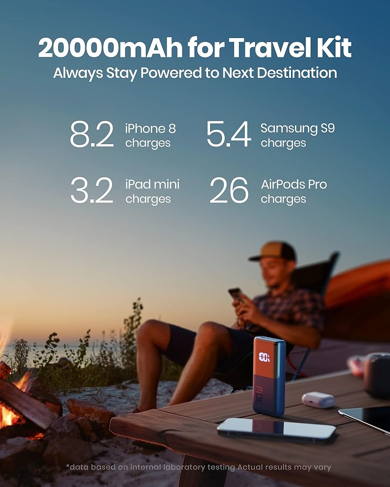 ✅【طاقة تدوم لمدة أسبوع يمكنك الاعتماد عليها】 سعة هائلة تبلغ 20,000 مللي أمبير في الساعة مجهزة لشحن AirPods Pro حتى 26 مرة، وiPhone 8 8.2 مرة، وiPad mini 3.2 مرة. كل هذه احتياجات الطاقة لمدة أسبوع واحد على الأقل للتنقل!