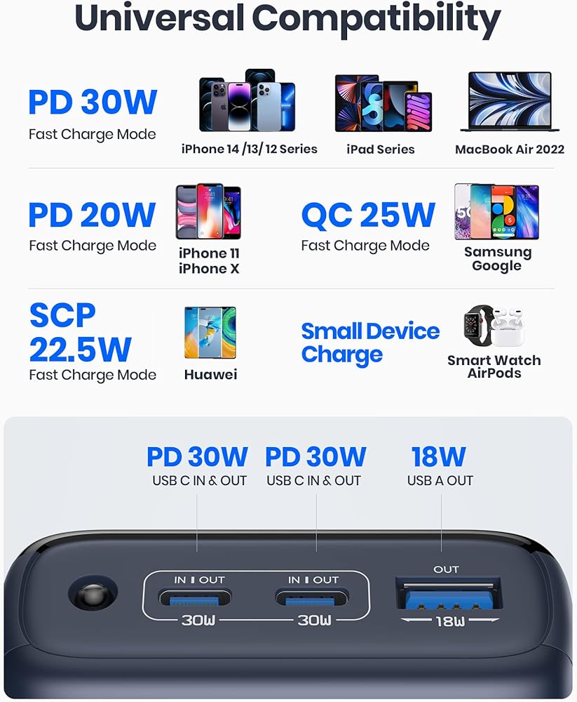 ✅[مدخل ومخرج USB C لأول مرة في السوق] على عكس 99% من شاحن البطاريات المحمولة USB C في السوق الذي يتميز بمدخل USB C فقط (لا يشحن أي أجهزة ولكن شاحن USB المحمول نفسه)، يحتوي SAFUEL PD 30W على مدخلين USB C ومنافذ خارجية لتناسب تمامًا أجهزة iPhone وiPad الجديدة وجميع أجهزة USB C القادمة.