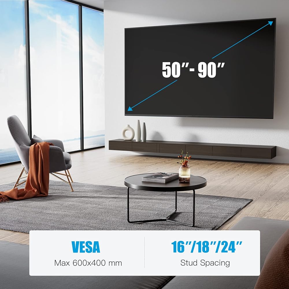 Wide TV Compatibility: This TV wall mount is compatible with 50-90 inch TVs with VESA patterns 200x100mm to 600x400mm. Designed for 16”-24” wood studs, concrete, and brick wall mounting. Do not mount on drywall alone.