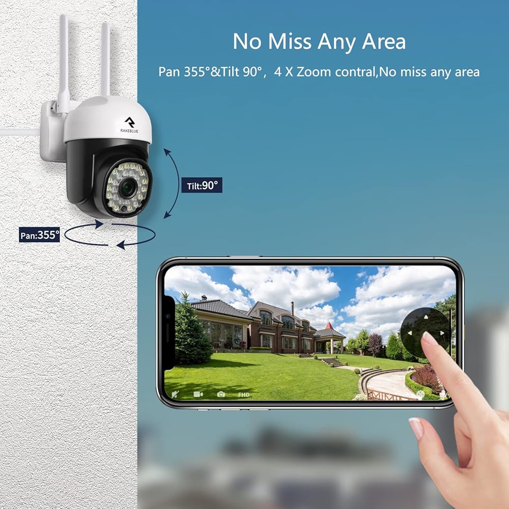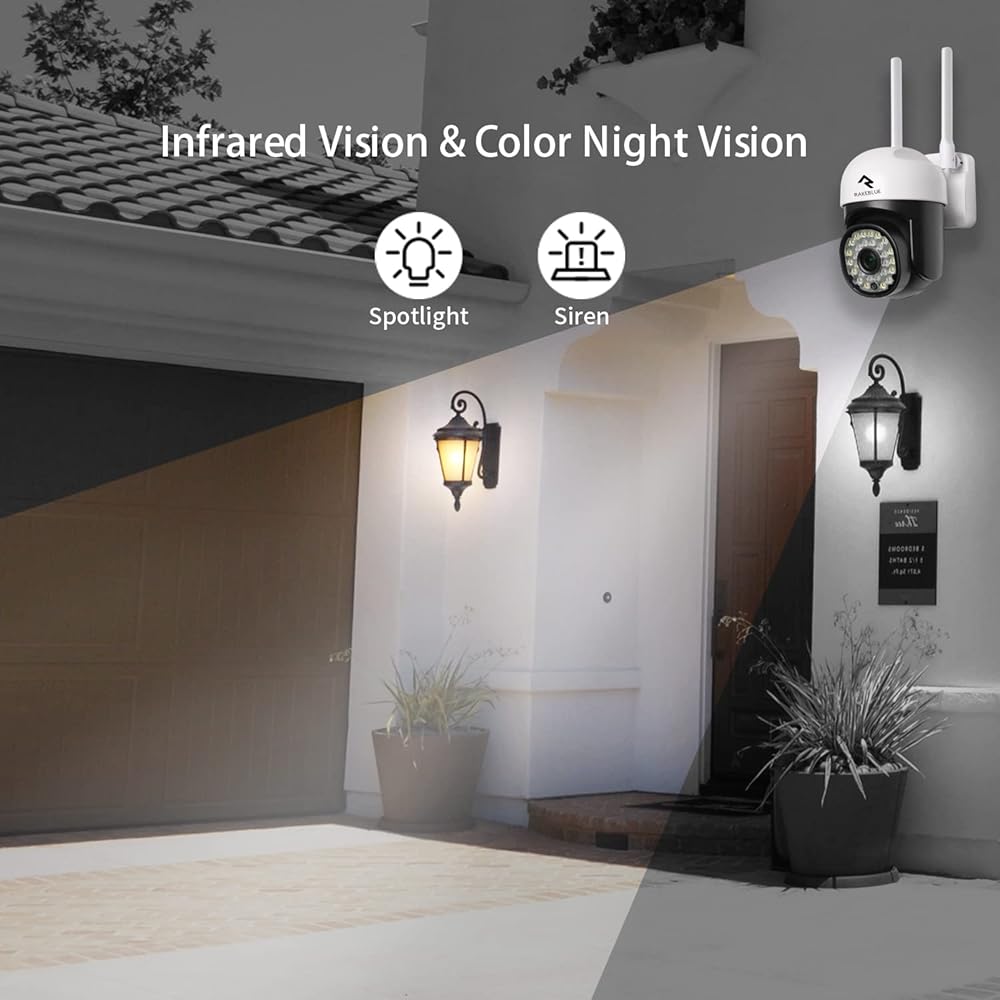 كاميرا أمان خارجية من RAKEBLUE، عبوتان، تخزين سحابي مجاني 1080 بكسل مع 2.4 جيجا / 5 جيجا واي فاي، كشف الحركة البشرية بإمالة 360 درجة ورؤية ليلية ملونة في اتجاهين