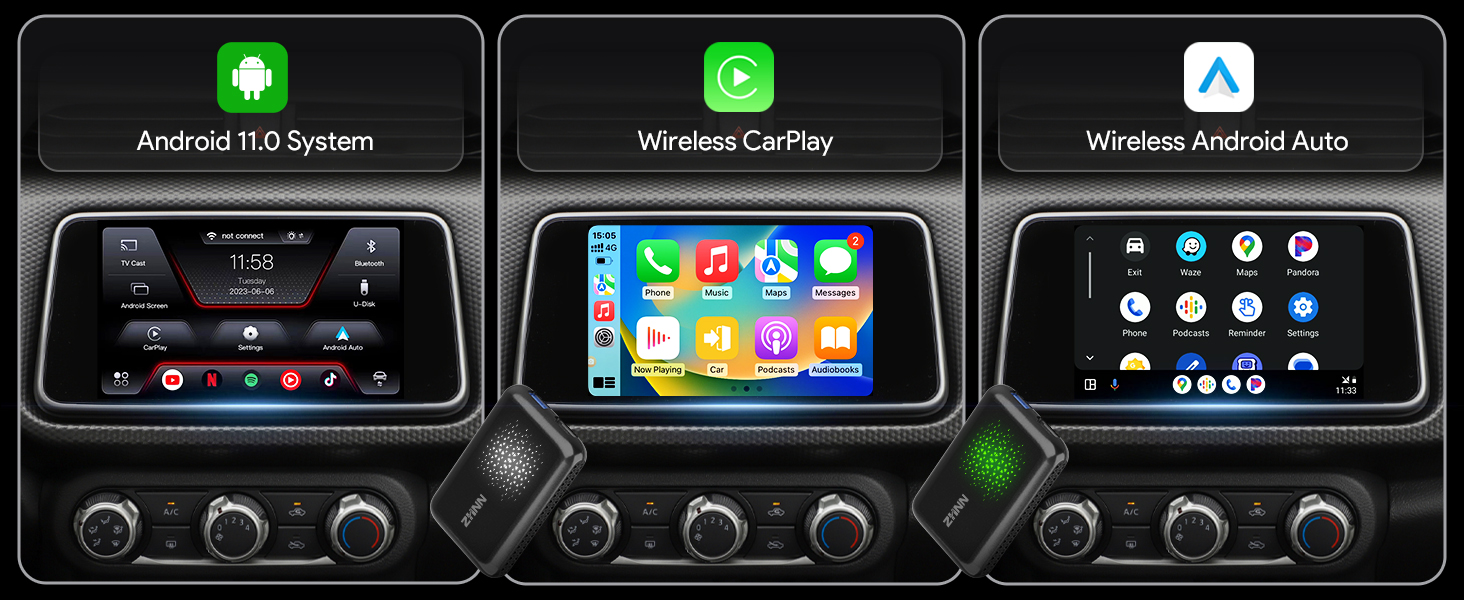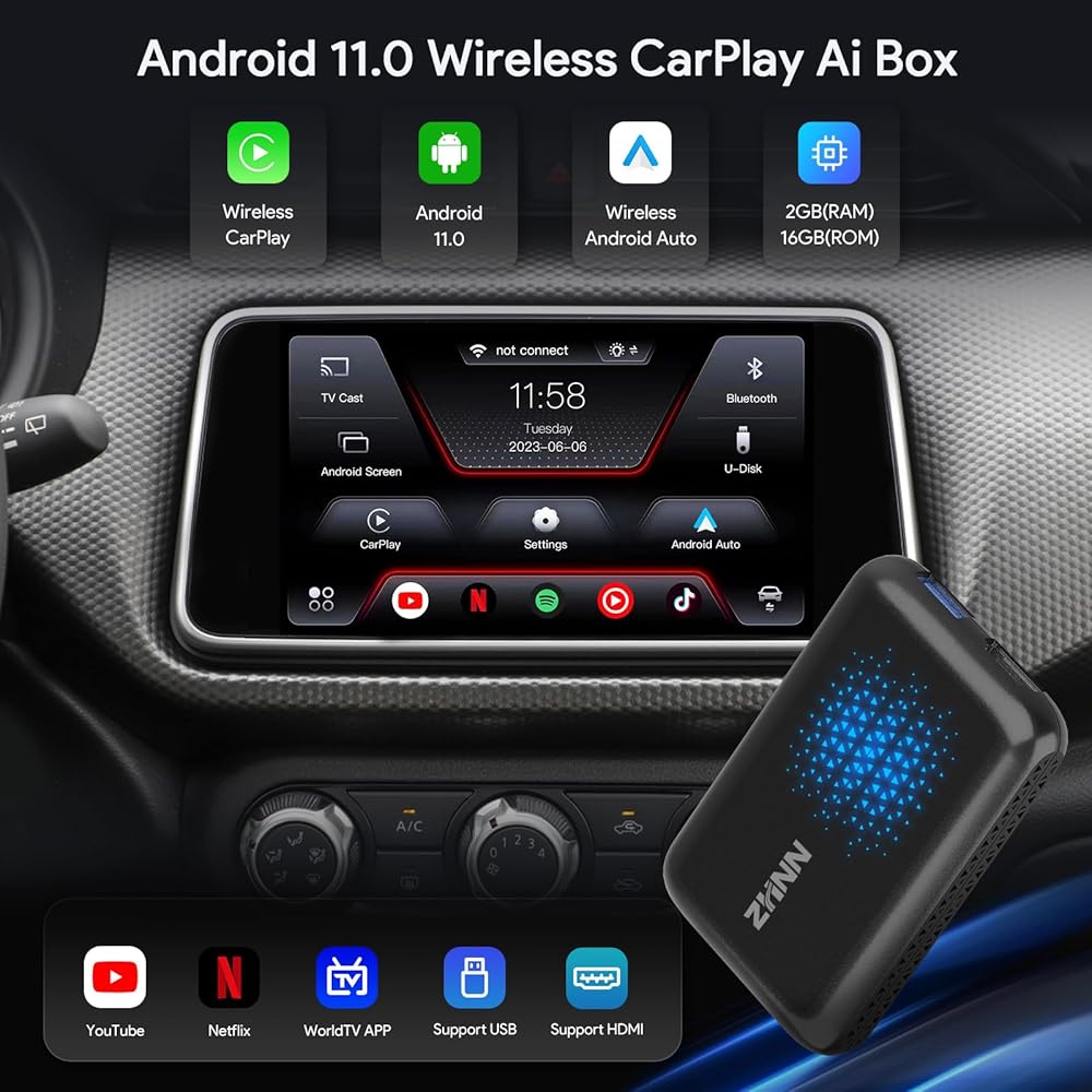 【ترقية صندوق Carplay السحري 4 في 1】مع نظام Android 11، Carplay اللاسلكي وAndroid Auto اللاسلكي، مخرج HDMI، يحول الصندوق السحري 4 في 1 سيارتك إلى مركز ترفيه. شريحة مدمجة رباعية النواة وواي فاي ثنائي القناة 2.4 جيجا و5 جيجا، مما يقلل من معدل التأخير ويحقق نقل سلس. يعمل صندوق ai box carplay متعدد الوظائف على تحويل سيارات carplay السلكية مع الهاتف إلى carplay اللاسلكي وهواتف android إلى android auto اللاسلكي.
