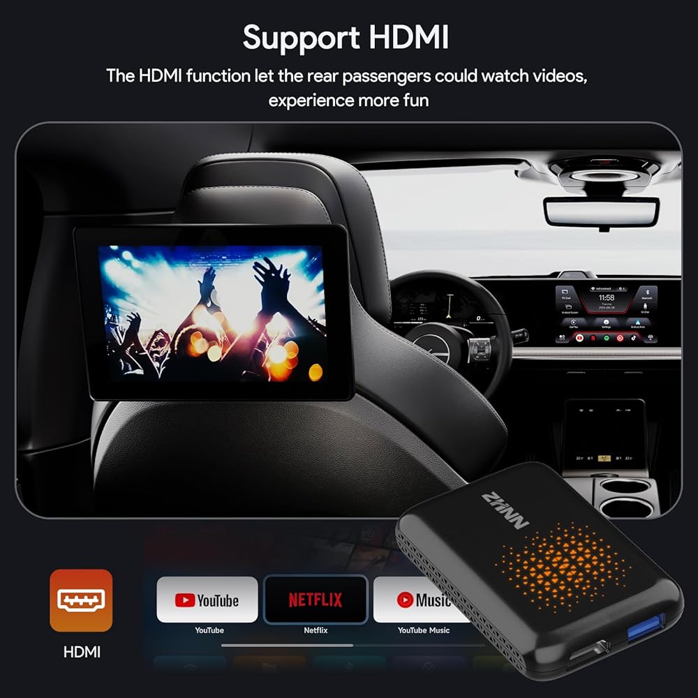 【يدعم مخرج HDMI】صندوق CarPlay AI هو جهاز بث فيديو متعدد الاستخدامات لا يحول CarPlay السلكي في سيارتك إلى لاسلكي فحسب، بل يعمل أيضًا كصندوق فيديو دفق HDMI. يضيف صندوق carplay AI هذا منفذ إخراج HDMI إضافي. يمكنك توصيل صندوق الذكاء الاصطناعي بشاشة مسند الرأس الخلفية أو التلفزيون عبر كابل HDMI لتجربة وضع السينما عالية الدقة، ومشاركة تجربة فيلم غامرة مع عائلتك وأصدقائك في السيارة أو في المنزل.