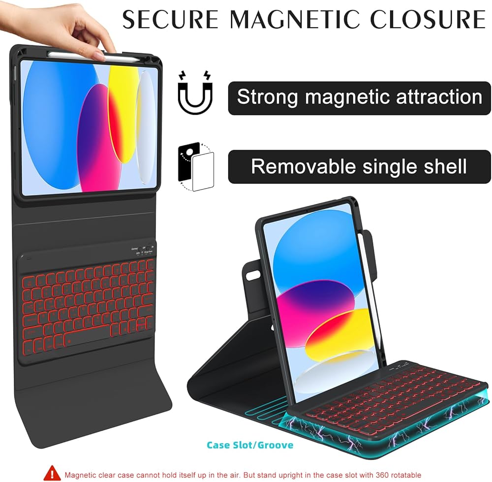 👍 لوحة مفاتيح بإضاءة خلفية - يتم فصل لوحة المفاتيح المغناطيسية والحافظة، ويتم توصيلهما مغناطيسيًا، ويمكن إزالة لوحة المفاتيح من الحافظة. 3 مستويات من السطوع و7 ألوان نابضة بالحياة تجعل الكتابة ممتعة وسهلة في الظلام أو الضوء. يمكن ربط لوحة مفاتيح iPad 10th مقاس 10.9 بوصة بالحافظة مغناطيسيًا، وإذا لم تكن هناك حاجة إليها، يمكن إزالتها. اتصال BT سهل التشغيل