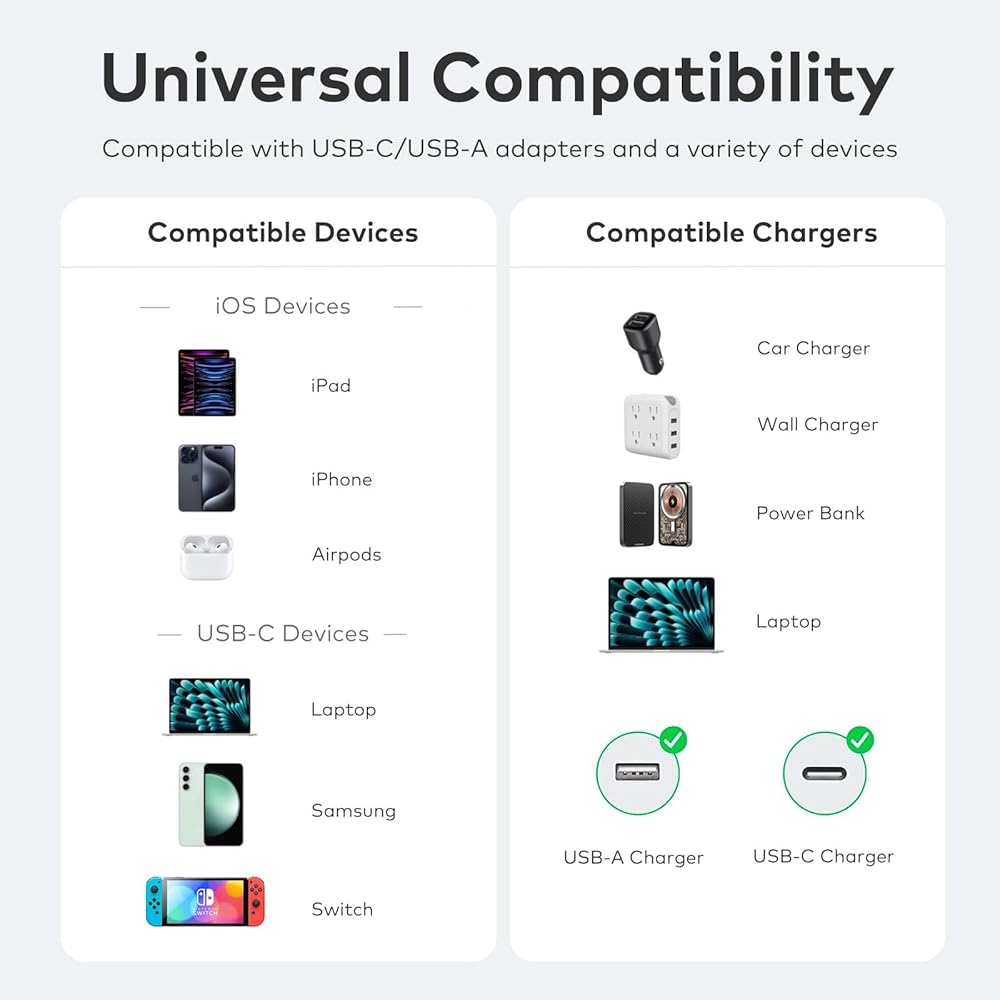 • حل شحن متعدد الأجهزة: توافق عالمي لجميع احتياجات الشحن الخاصة بك مع USB-A، وUSB-C، وموصلات الشحن السريع والقدرة على التكيف مع محول الطاقة. على سبيل المثال، iPhone 14/14 Plus/14 Pro/14 Pro Max/iPhone 13/13 Mini/13 Pro/13 Pro Max/iPhone 12/12 Mini/12 Pro/12 Pro Max/iPhone 11/SE Series؛ آيباد برو/إير/ميني؛ MacBook Pro 14 بوصة/MacBook Pro 16 بوصة/MacBook Air/MacBook Pro 13 بوصة؛ سلسلة AirPods؛ سلسلة ساعات Apple؛ Galaxy S22/S22+/S22 Ultra/S21/S21+/S21 Ultra/S20/Note20؛ Switch، إلخ.