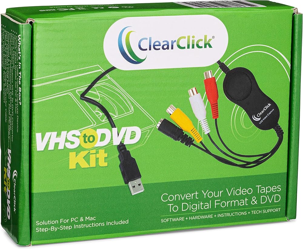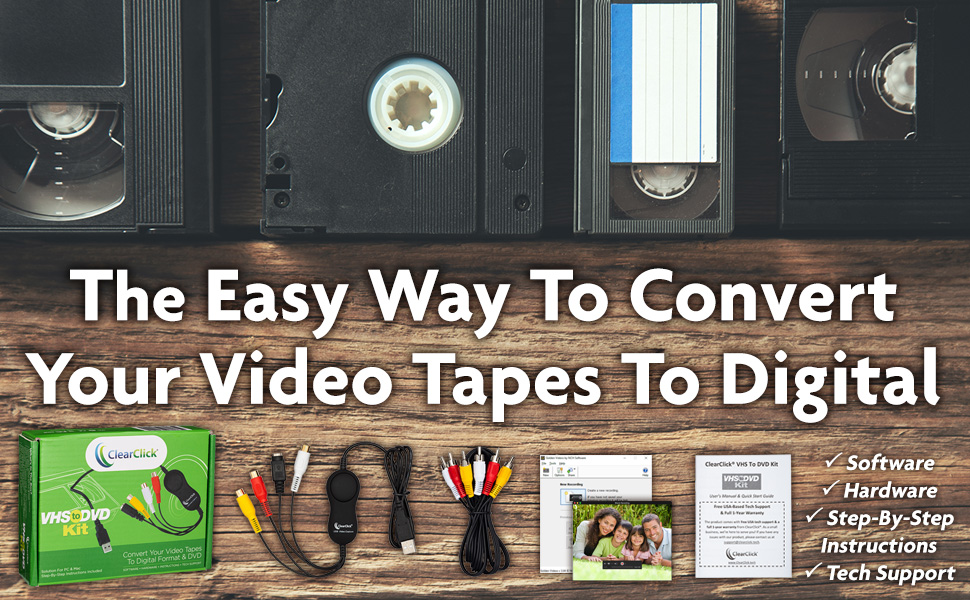 يمكنك بسهولة تحويل أشرطة VHS وأشرطة كاميرا الفيديو إلى تنسيق رقمي أو أقراص DVD باستخدام مجموعة كلير كليك VHS إلى DVD للكمبيوتر الشخصي وأجهزة Mac.