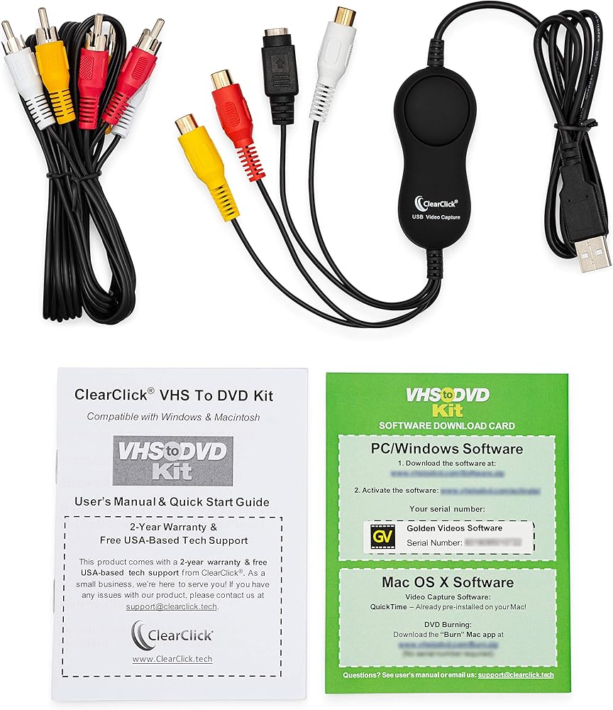 تتضمن هذه المجموعة: جهاز التقاط فيديو يو اس بي، وكابل نقل فيديو 3 ار سي ايه، وبرنامج، وتعليمات خطوة بخطوة، ودعم فني للبريد الإلكتروني في الولايات المتحدة الأمريكية من كلير كليك.