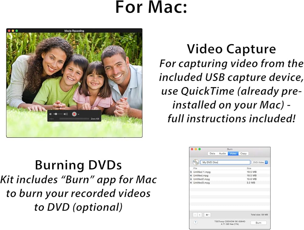 برنامج متضمن لجهاز ماك: برنامج حرق دي في دي "بيرن" (لالتقاط الفيديو، يتم تضمين التعليمات حول كيفية استخدام ميزة التقاط الفيديو المدمجة في Mac.)