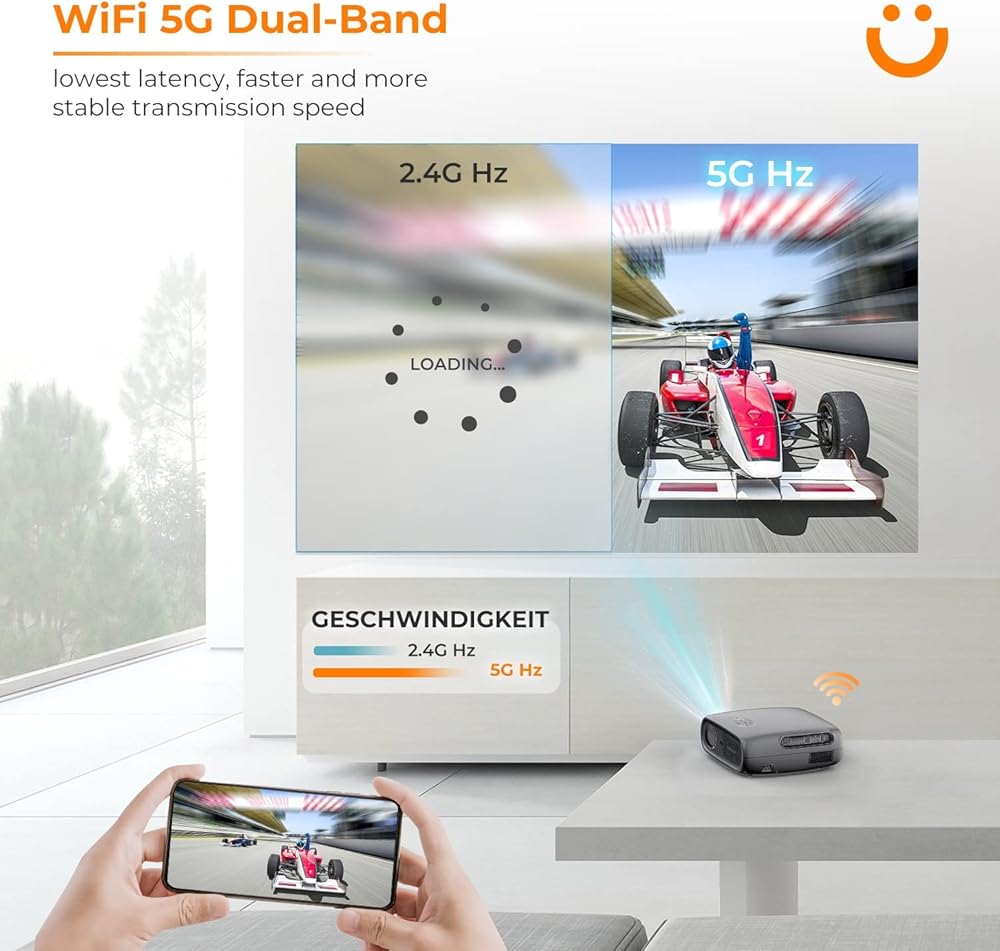 • ⚡【سريع ومستقر 5G/2.4G WiFi وبلوتوث 5.2 】يدعم جهاز عرض YABER Pro U7 wifi ثنائي النطاق 5 جيجا هرتز و2.4 جيجا هرتز، ويدعم 5G WiFi معدلات لاسلكية أعلى يمكن أن تجعل نقل الصور/الفيديو أكثر سلاسة وبدون تأخير. كما يحتوي جهاز العرض البلوتوث هذا على وظيفة بلوتوث 5.2 مدمجة مع نظام صوت SRS يمكنه الاتصال بسماعات رأس بلوتوث ومكبرات صوت بلوتوث وAirpods. تعمل الشاشة الأكبر حجمًا والمؤثرات الصوتية المتميزة على زيادة سعادتك كسينما منزلية، مما يمنحك تجربة مسرحية.