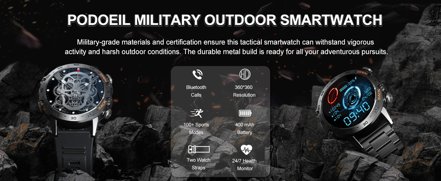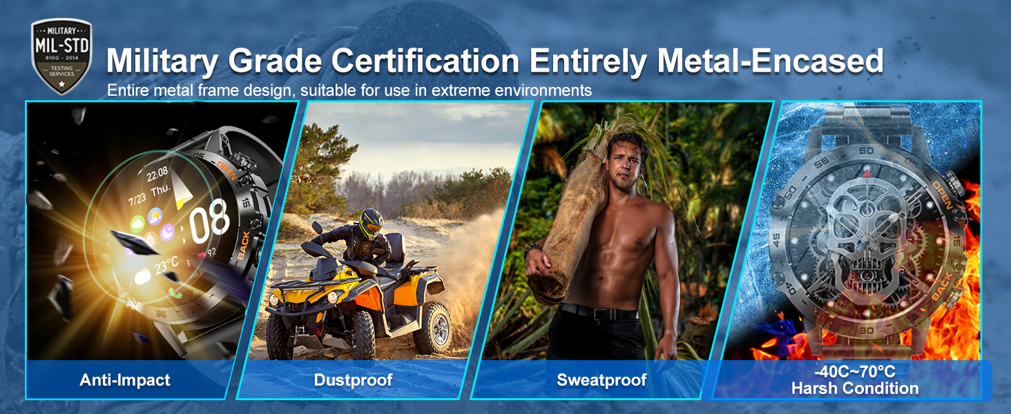 • ⌚[إطار معدني بالكامل ومعتمد من الدرجة العسكرية] خضعت الساعة الذكية العسكرية لـ 15 اختبارًا من اختبارات المتانة الأكثر صرامة - محاكاة الصحارى والغابات المطيرة وأحوال القطب الشمالي، مما يثبت أن الساعة المصممة بشكل متين بما يكفي لأي بيئة يمكن أن تكون ذكية بما فيه الكفاية إمكانية الوصول. بفضل مقاومة الماء بمعيار IP67، يمكن للساعة تحمل رذاذ الماء والعرق وغير ذلك الكثير، مما يسمح لك بارتدائها أثناء غسل يديك أو تحت المطر الخفيف (غير مناسبة للسباحة أو الغمر لفترة طويلة).