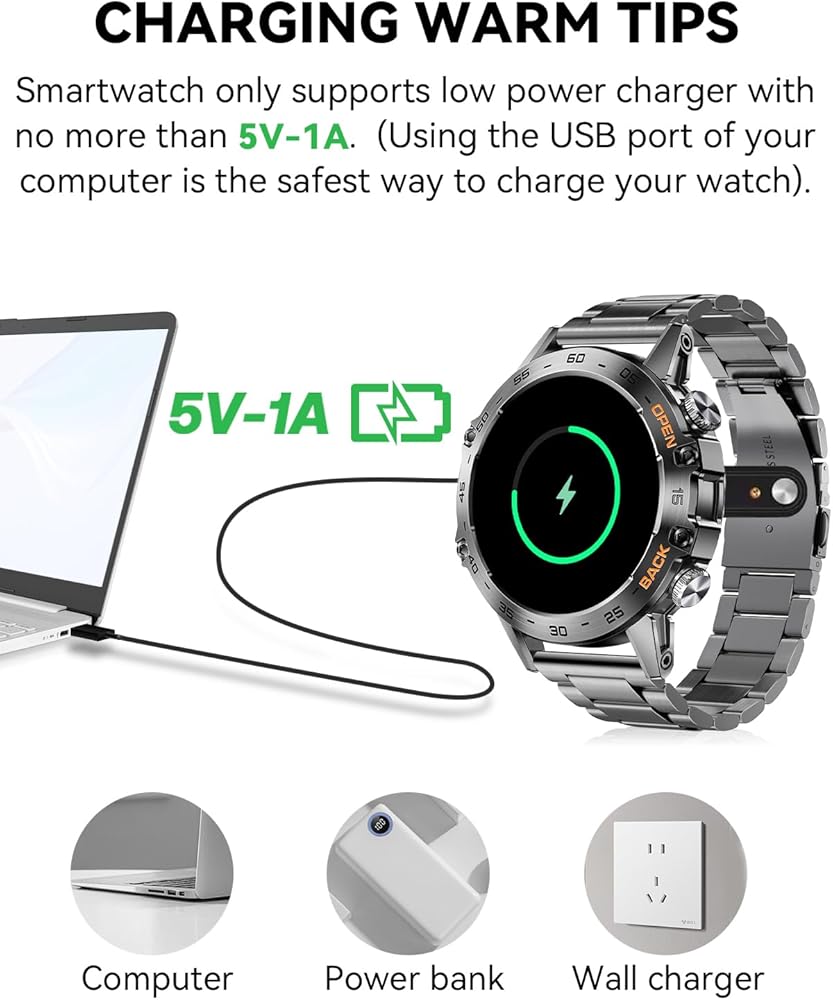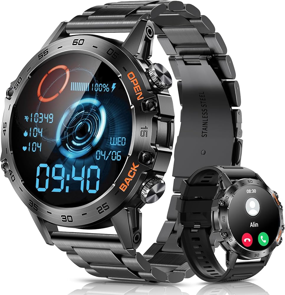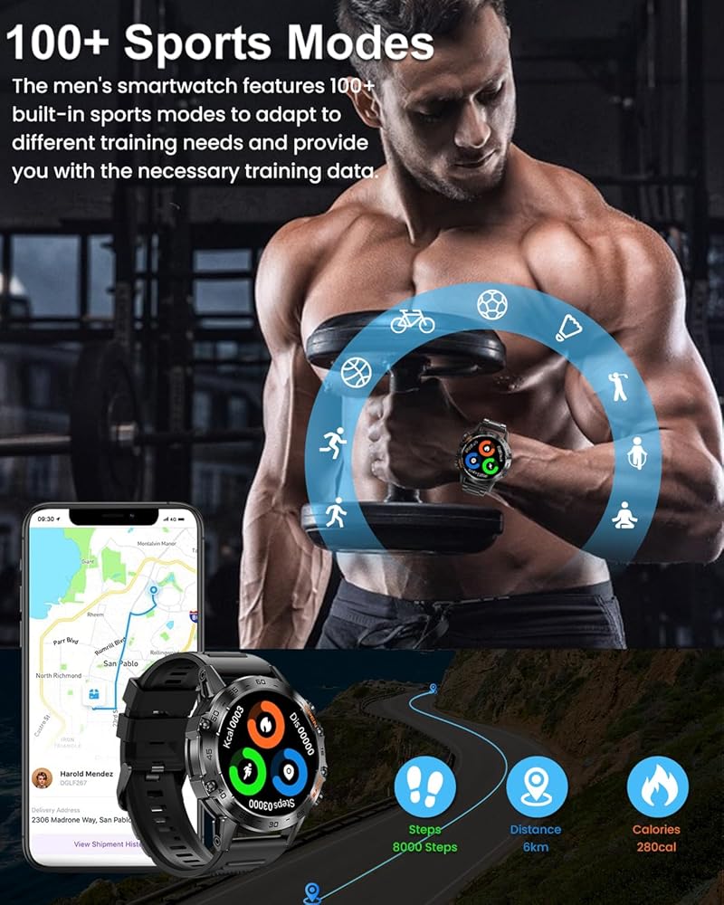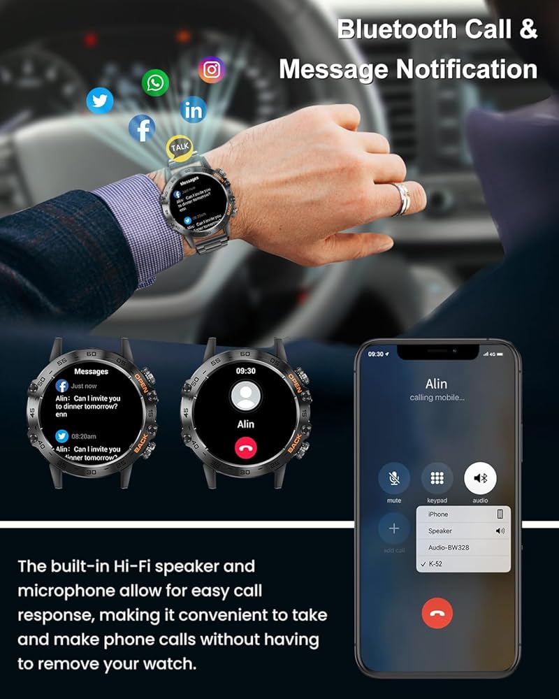 • ⌚ 【إشعارات مكالمات ورسائل البلوتوث】تتيح لك الساعة الذكية الاتصال بسهولة عبر التطبيق لإجراء مكالمات بلوتوث والاستماع إلى الموسيقى. قم بالرد على المكالمات واحصل على تنبيهات الاهتزاز للرسائل وتحديثات التطبيقات، كل ذلك من معصمك. يحررك هذا من التحقق المستمر من هاتفك أثناء القيادة أو ممارسة الرياضة أو القيام بأنشطة تجعل حمل هاتفك أمرًا صعبًا. تبقيك هذه الساعة الذكية التكتيكية على اطلاع مع تقليل عوامل التشتيت، مما يسمح لك بالتركيز بشكل كامل على ما تفعله.