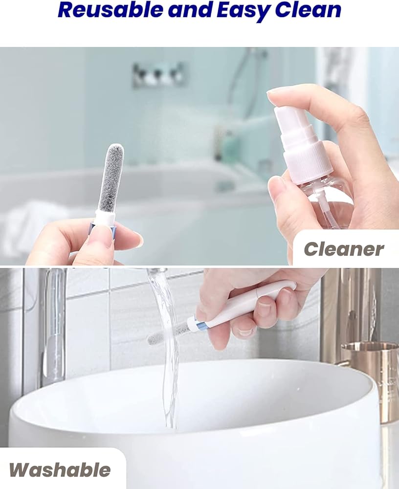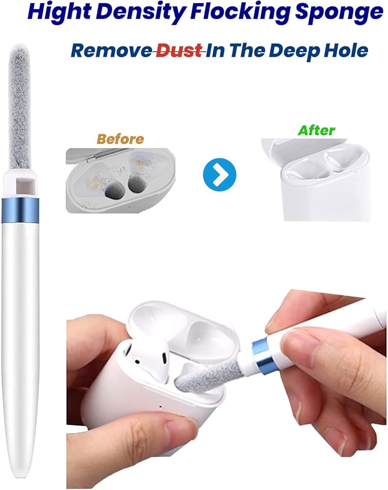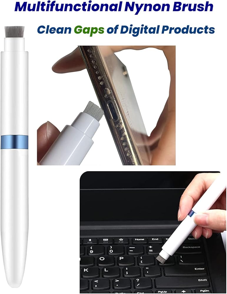 ترقية 4 في 1: يحتوي قلم التنظيف متعدد الوظائف على 4 أجزاء في 1، وهي عبارة عن إسفنجة متدفقة للثقب مثل علبة الشحن، وفرشاة صغيرة ناعمة عالية الكثافة وسن معدني لسماعات الرأس، وفرشاة من النايلون للوحات المفاتيح؛