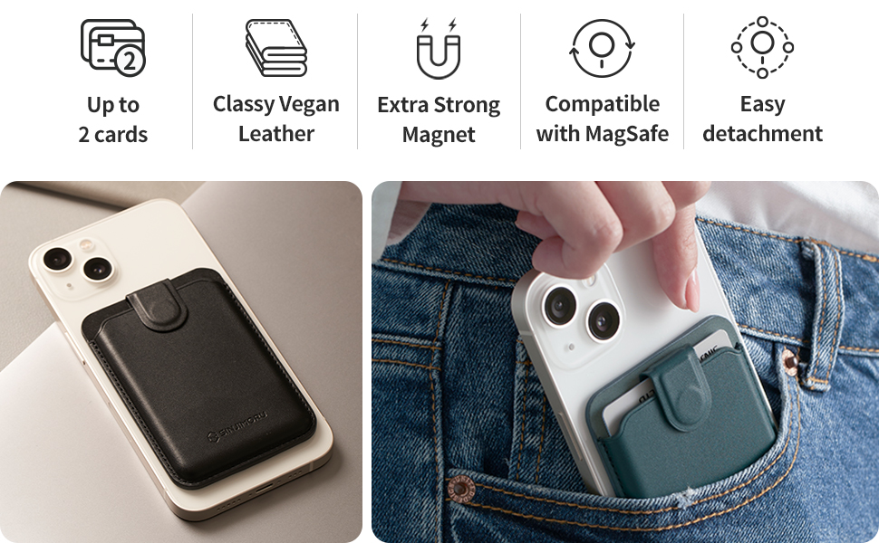 محفظة هاتف مغناطيسية قوية قابلة للفصل: محفظة هاتف لاصقة بقوة مغناطيسية قوية 1800 جيجا يتم ربطها بقوة بحافظة محفظة هاتفك الذكي. يمكن إزالة حامل البطاقة ببساطة للشحن اللاسلكي على عكس العصا الموجودة في محفظة الهاتف.