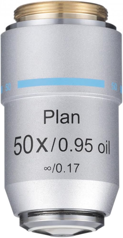 50xR غمر الزيت إنفينيتي DIN Plan Achromat Objective يناسب مجهر Accu-Scope Series 3000-LED، EXC-350، EXC-400، 3012، و3000