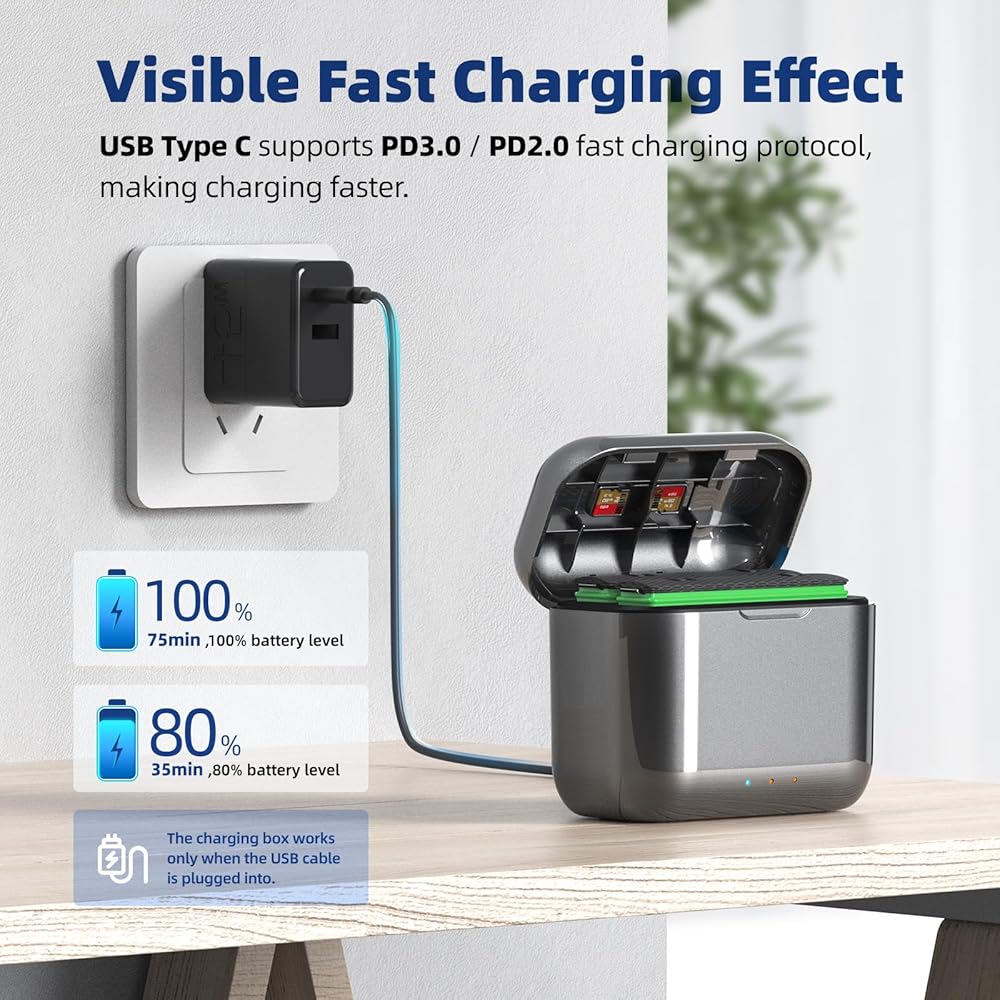 【ملحقات NBZZ Insta 360 x3 】 يحتوي شاحن NBZZ Insta على منفذ من النوع C، صندوق تخزين مدمج MicrsoSD، مع الشحن الزائد، والدائرة القصيرة، والحرارة الزائدة، والتيار الزائد والجهد الزائد. شريك أفضل لـ 360 X3؛ خدمة ما بعد البيع لمدة 24 شهرًا، يتم استبدالها فقط، ولا يتم إصلاحها.