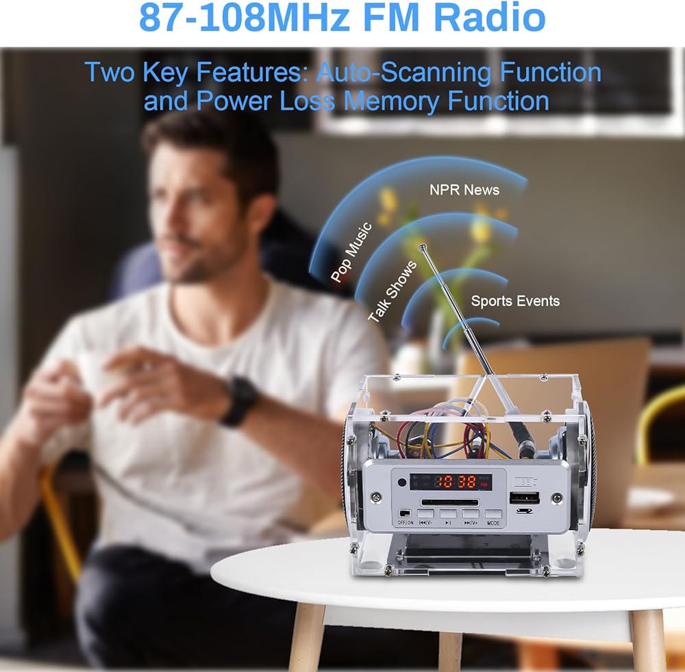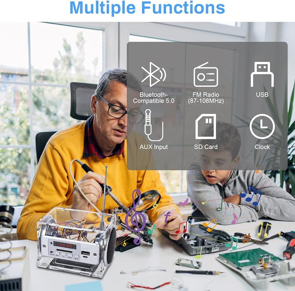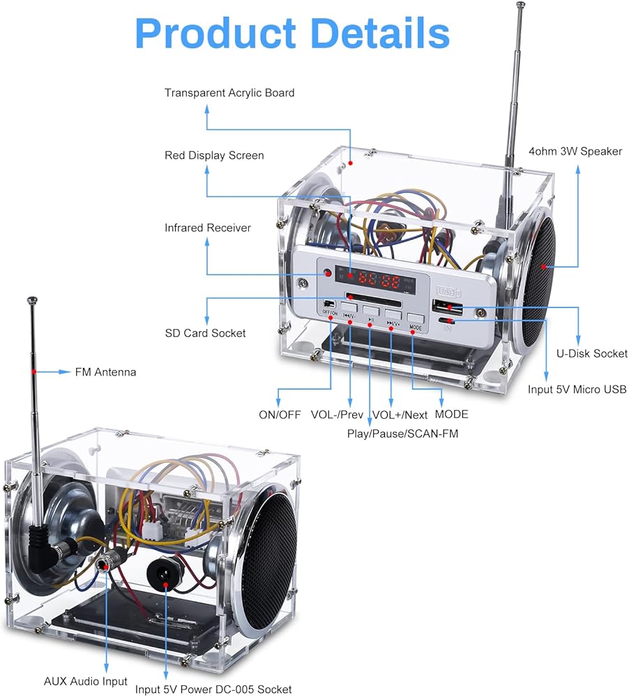 【خيارات تشغيل متعددة الاستخدامات: USB، AUX، بطاقة SD】توفر مجموعة مشروع اللحام مدخلات USB وAUX وبطاقة SD، مما يلبي تفضيلات التشغيل المختلفة. فهو يدمج ميزات متعددة في وحدة مدمجة واحدة. بالإضافة إلى ذلك، تتميز مجموعة مشروع اللحام بوظيفة الساعة. بالضغط على زر "تشغيل/إيقاف مؤقت"، يمكنك التبديل بين إعدادات "الساعة" و"الدقيقة". اضبط الوقت باستخدام الأزرار لأعلى/لأسفل. (ملاحظة: تعديل الوقت مطلوب بعد كل بدء تشغيل)