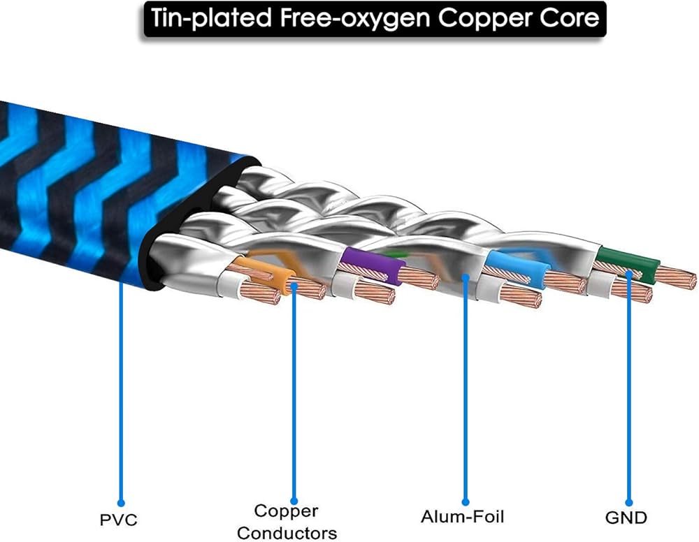 ★ 【مواد متفوقة 】 كابل Cat7 المضفر من النايلون 4 زوج ملتوي محمي من الأسلاك النحاسية (STP) مزدوج الحماية للحماية من التداخل، موصل RJ45 مع دبابيس اتصال مطلية بالذهب 50 ميكرون. لنقل البيانات بشكل آمن وموثوق. بالإضافة إلى مادة الغلاف PVC والمواد العازلة HDPE، يمكننا الاستمتاع بشبكات سريعة وآمنة