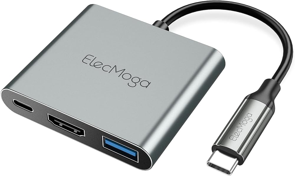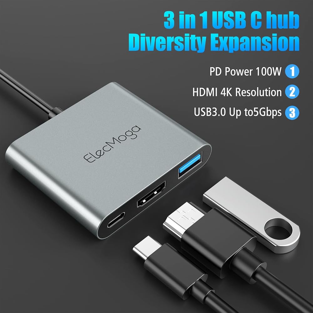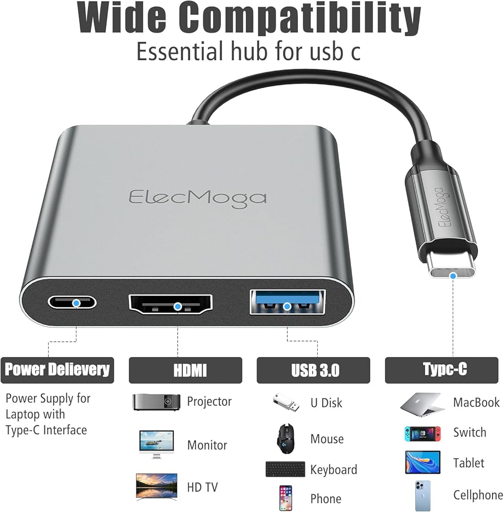 محول ElecMoga USB C إلى HDMI، مخرج USB C Hub-4K HDMI مع USB 3.0 + USB C متعدد المنافذ AV محول محول رقمي متوافق مع منفذ شحن لأجهزة MacBookPro وiPad وHP وSamsung S23 والمزيد - رمادي