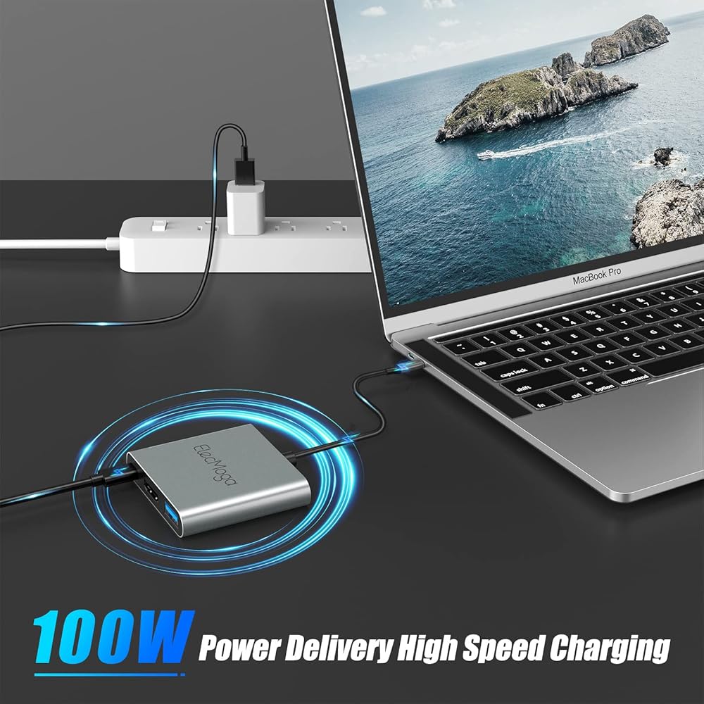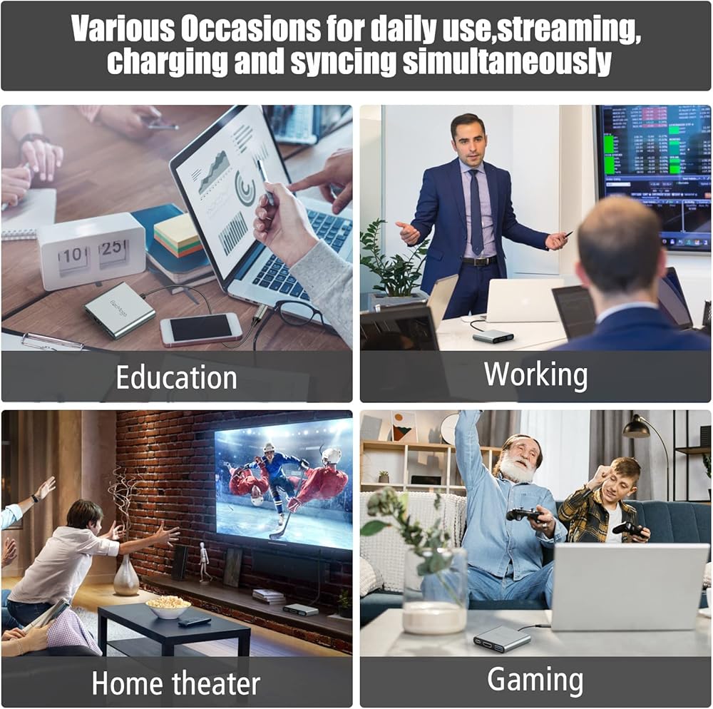 【يوفر USB C الشحن】محول USB من النوع C إلى HDMI مصمم بمنفذ شحن من النوع C بقدرة 100 وات، يمكنك شحن أجهزة الكمبيوتر المحمولة/الأجهزة اللوحية/الهواتف المزودة بمنفذ USB c. بسرعة عند استخدام منافذ أخرى. لا تقلق بشأن نقص الطاقة. لا حاجة لتثبيت أي برامج تشغيل، التوصيل والتشغيل.