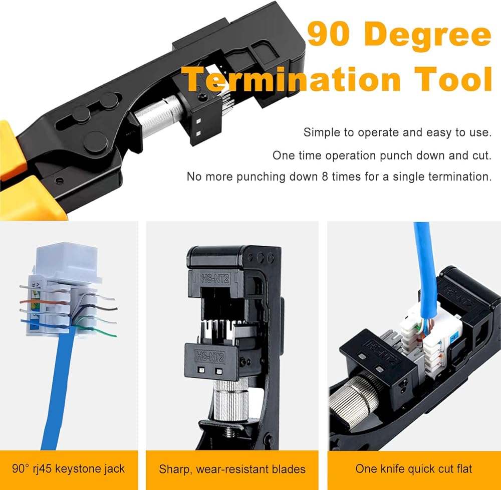 The tool comes with 90 degree RJ45 CAT.6 keystone jacks x 10 and CAT.5E keystone jacks x 10. for use ONLY with 90 degree keystone jacks