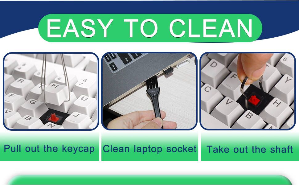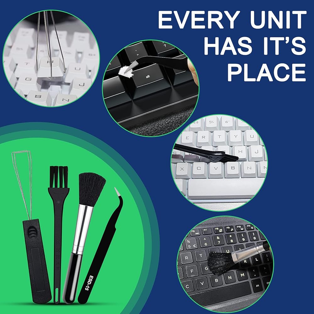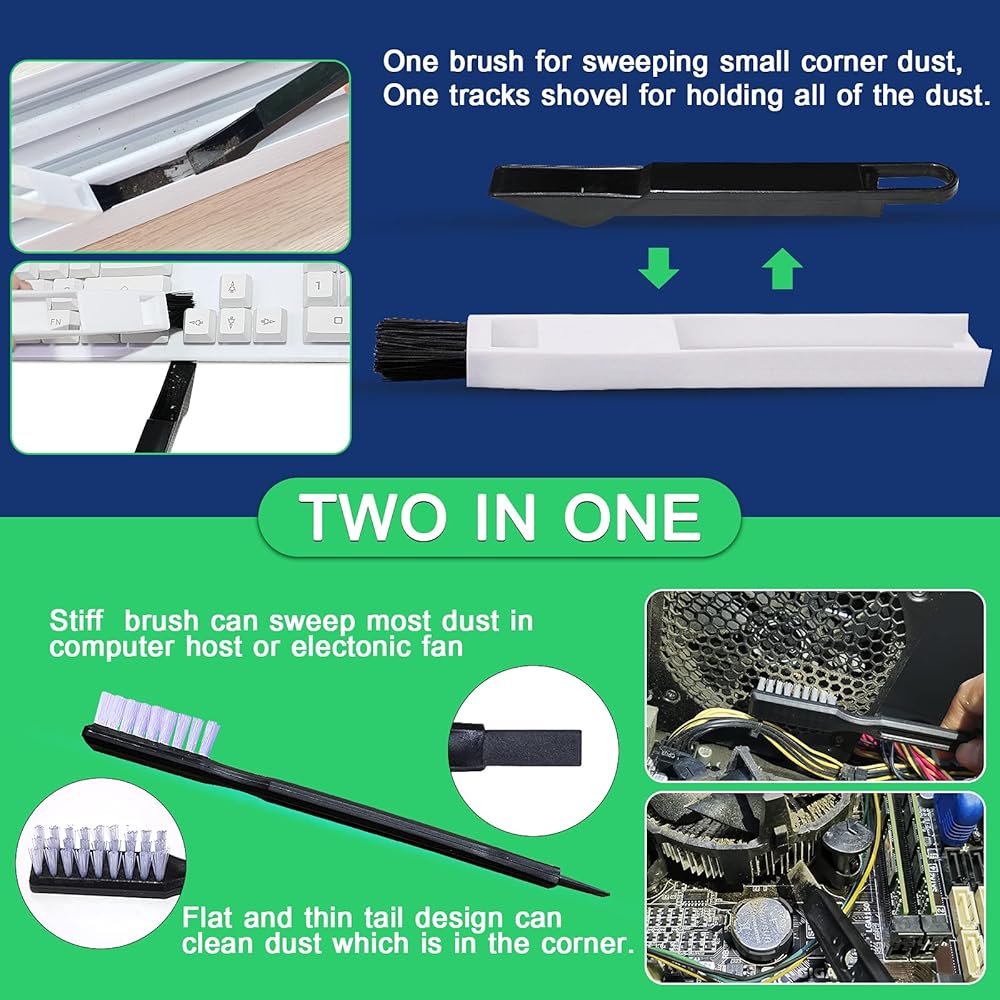 4 فرش مفيدة: 1 فرشاة بشعيرات نايلون + 1 فرشاة تنظيف للمسارات + 1 فرشاة لفجوة لوحة المفاتيح + 1 فرشاة ناعمة، فرشاة شعيرات النايلون تستخدم لأتربة لوحة دائرة الكمبيوتر، ويمكنك استخدام فرشاة تنظيف المسار لمسح الغبار، إذا كنت ترغب فقط في تنظيف لوحة المفاتيح الخاصة بك، استخدم فرشاة فجوة لوحة المفاتيح وفرشاة ناعمة أخرى.