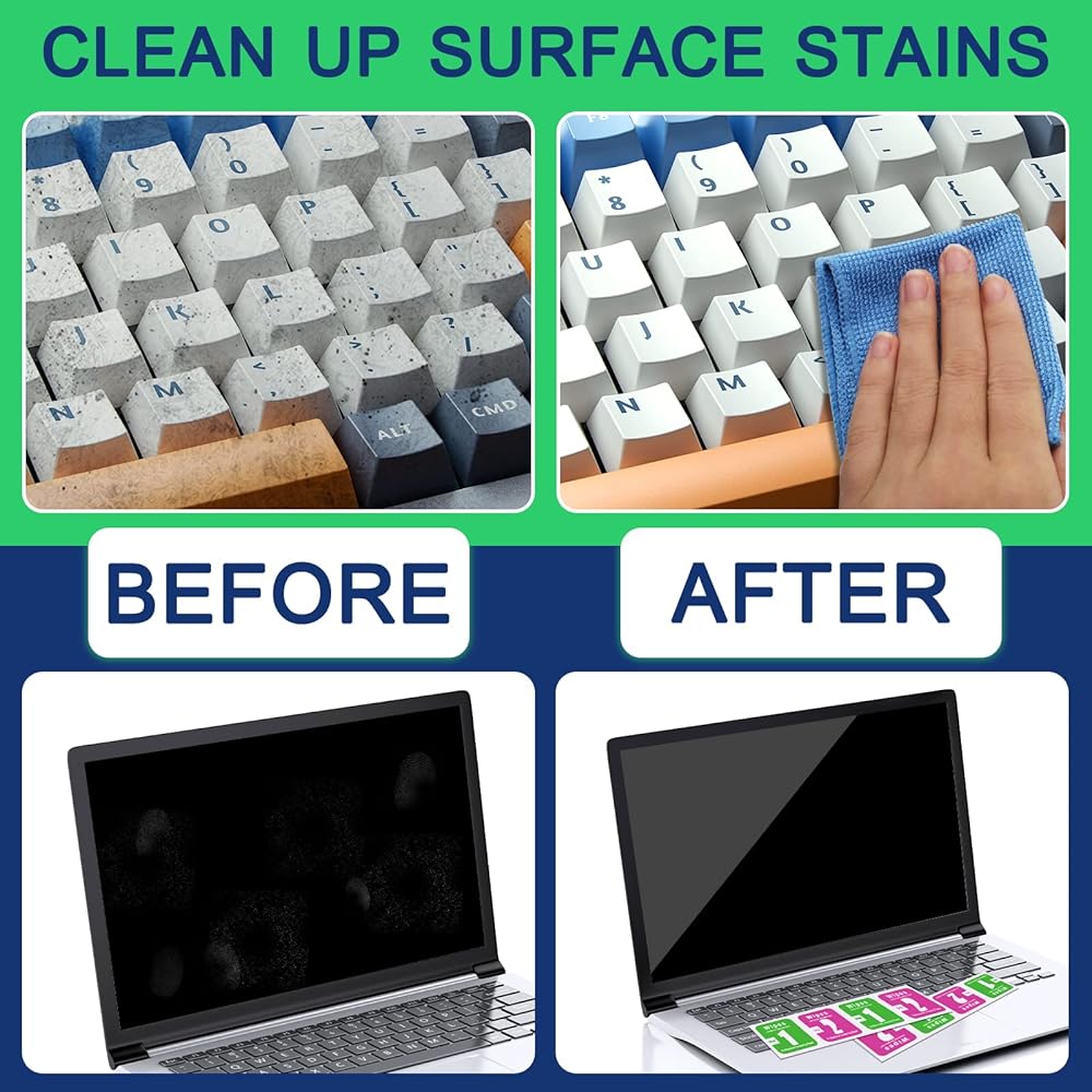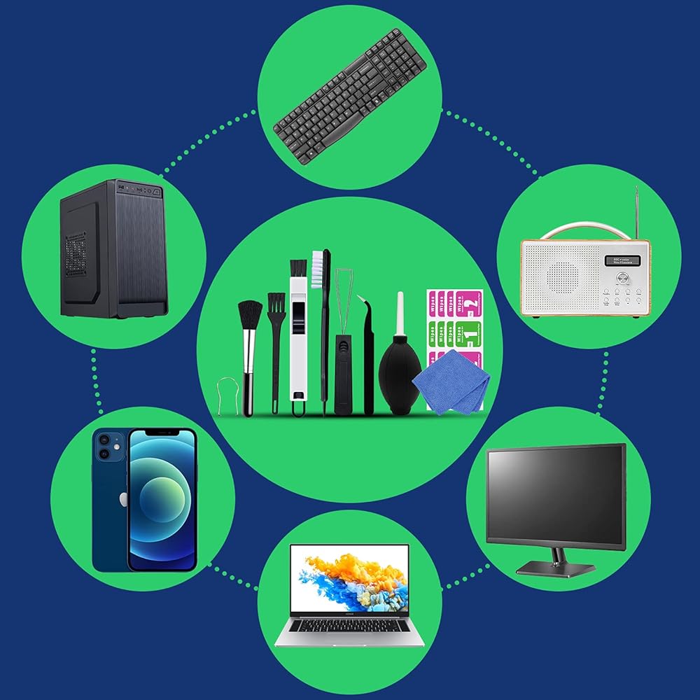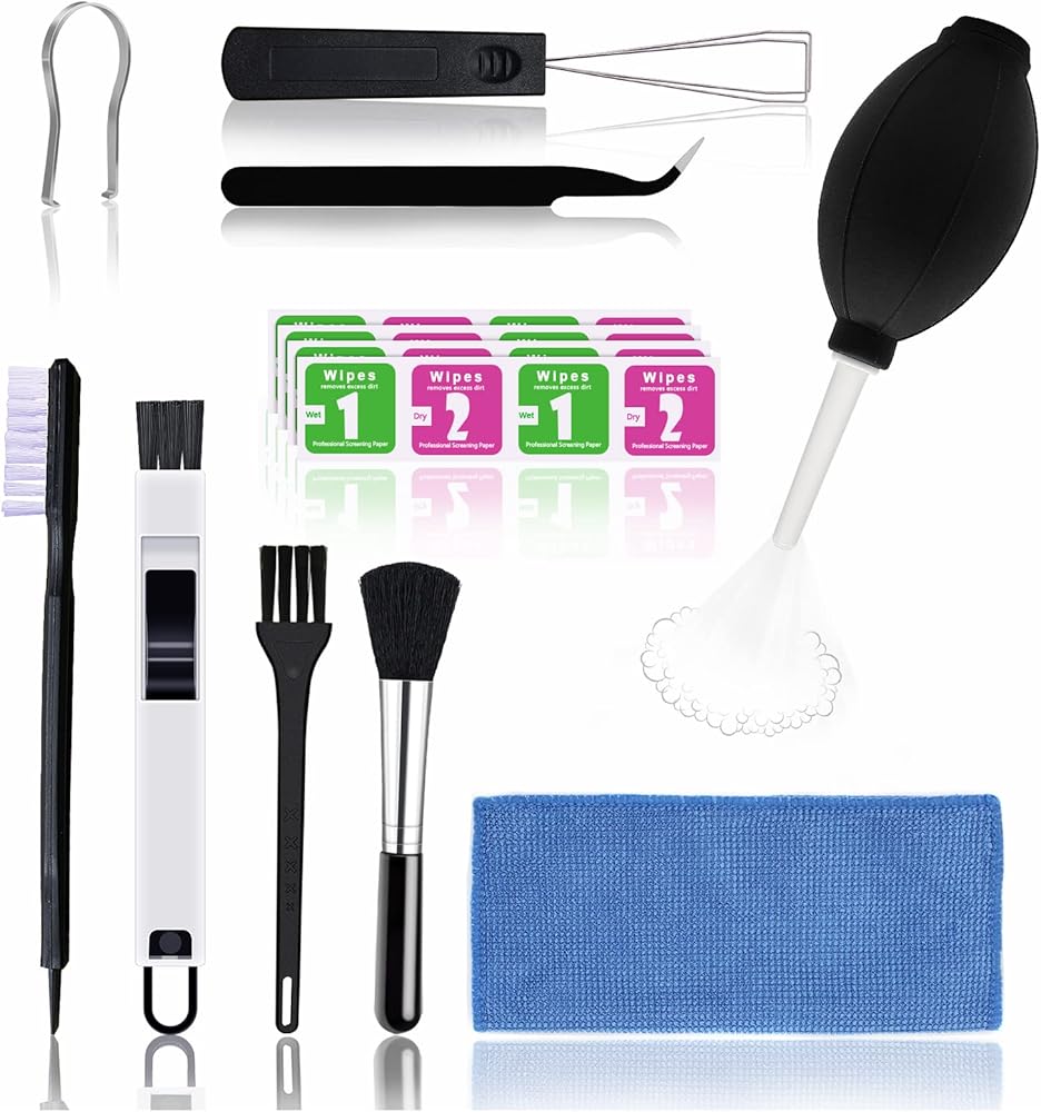 ما تحصل عليه: 1 فرشاة بشعيرات من النايلون + 1 فرشاة تنظيف للمسارات + 1 فرشاة لفجوة لوحة المفاتيح + 1 فرشاة ناعمة + 1 منفاخ هواء + 1 ملقاط + 1 منديل شاشة كمبيوتر + 2 أداة سحب لوحة مفاتيح + 8 مناديل منظفة.