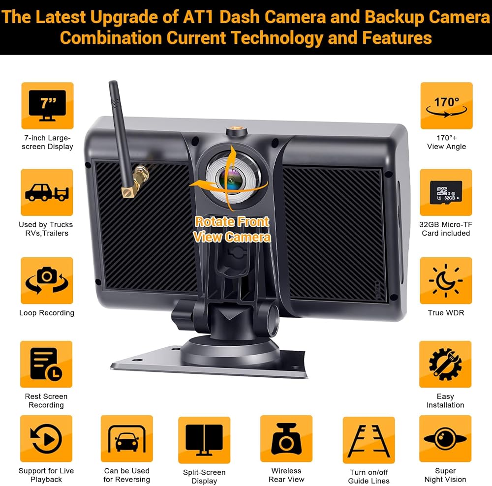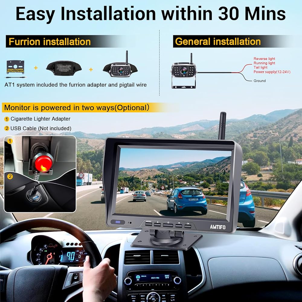 كاميرات AMTIFO المزدوجة RV كاميرا احتياطية كاميرا أمامية لاسلكية دوران 360 درجة - التوصيل والتشغيل متوافق مع تسجيل التركيب السلكي مسبقًا من Furrion بدون تأخر شاشة 7 بوصة للمقطورات/الشاحنات/المعسكرات AT1