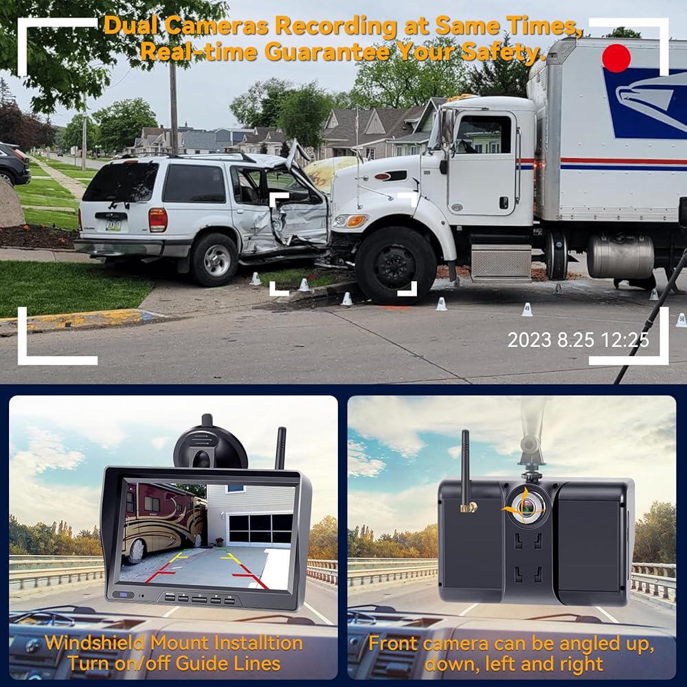 مجموعة الكاميرا الاحتياطية والكاميرا الأمامية - تصميم مبتكر: كاميرا الرؤية الخلفية RV وكاميرا أمامية لاسلكية RV تعمل معًا بشكل مزدوج، تجمع بين الكاميرا اللاسلكية الأمامية والخلفية مع شاشة كاميرا احتياطية كبيرة مقاس 7 بوصة حتى تتمكن من رؤية محيطك أثناء القيادة الرجوع إلى الخلف. استمتع براحة مجموعة الكاميرا الاحتياطية للمركبة الترفيهية أثناء التقاط لقطات مهمة أيضًا. يعد هذا التصميم المبتكر أمرًا ضروريًا لأي مالك مركبة يبحث عن إمكانات إضافية للسلامة والتسجيل