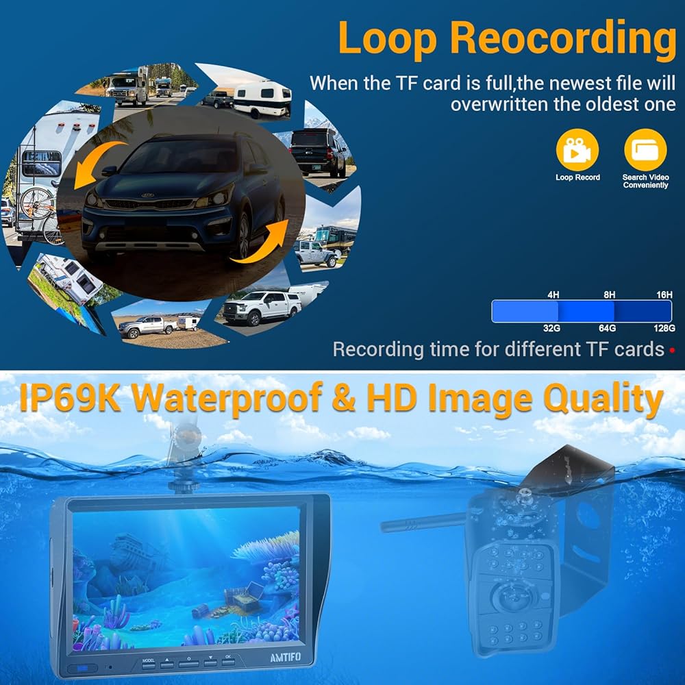ميزات التكنولوجيا المتقدمة: تتميز الكاميرا الاحتياطية اللاسلكية للمقطورة بعدسة واسعة الزاوية تزيد عن 170 درجة مع صورة مقلوبة، مع خطوط توجيه احتياطية، وتصنيف IP عالي يبلغ 69 لمقاومة لا مثيل لها للماء والطقس. توفر الكاميرا الاحتياطية المزودة بشاشة rv IPS صورة واضحة دون انعكاس أو ضبابية، بينما توفر 18 مصباحًا بالأشعة تحت الحمراء جودة صورة عالية الدقة. مع كاميرا الرؤية الأمامية القابلة للدوران، سوف تستمتع بتجربة قيادة ثورية.
