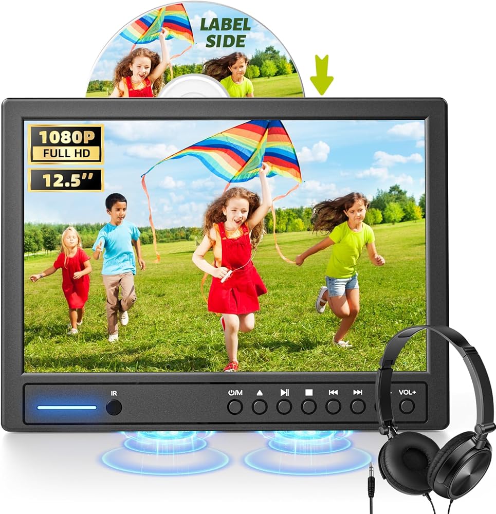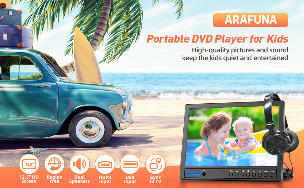 ارافونا مشغل دي في دي محمول للسيارة 12.5 انش مع سماعة رأس، مشغل دي في دي للسيارة مع حامل مسند الرأس، قرص من نوع الشفط، يدعم فيديو 1080P، مدخل HDMI، مدخل ومخرج ايه في، قارئ بطاقة USB/SD، ذاكرة اخر