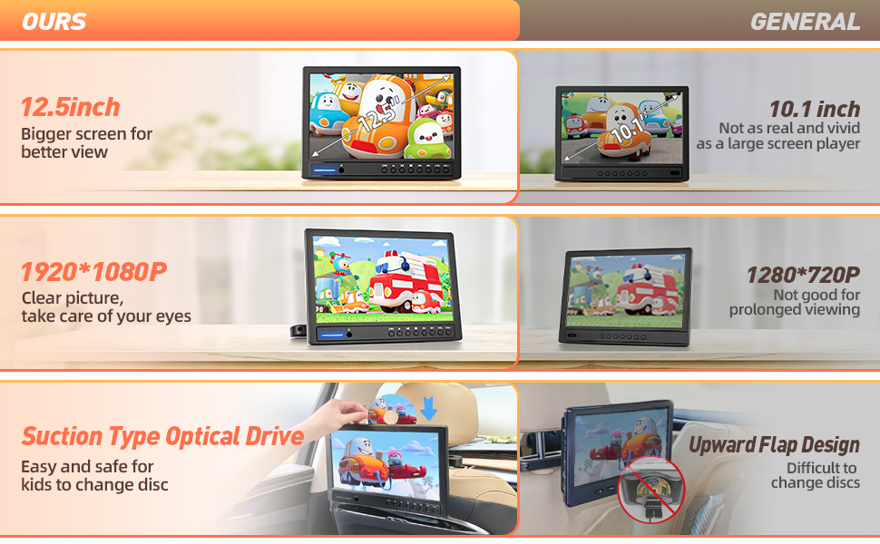 💟【شاشة كبيرة وجودة صورة عالية الدقة】مشغل دي في دي محمول بشاشة كبيرة ارافونا مقاس 12.5 انش للأطفال بدقة 1920 × 1080 بكسل أكثر وضوحًا من 720 بكسل وله مساحة عرض أكبر من مشغل دي في دي للسيارة مقاس 10.1 انش للأطفال. إنها أكثر ملاءمة للاستخدام في رحلات السيارة الطويلة، ولن تجلب الصورة الواضحة متعة بصرية أفضل لطفلك فحسب، بل أيضًا أضرار أقل لعيون الأطفال. بالإضافة إلى ذلك، فإن مشغل دي في دي بمسند الرأس للسيارة قادر على ضبط جودة الصورة ودرجة حرارة اللون.