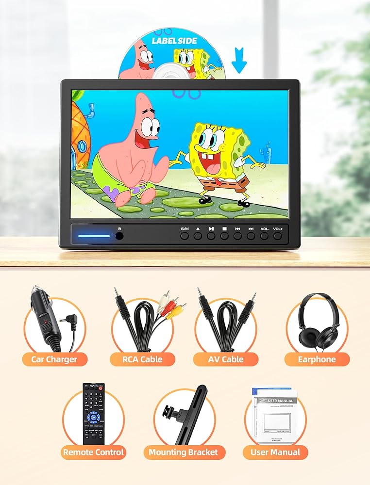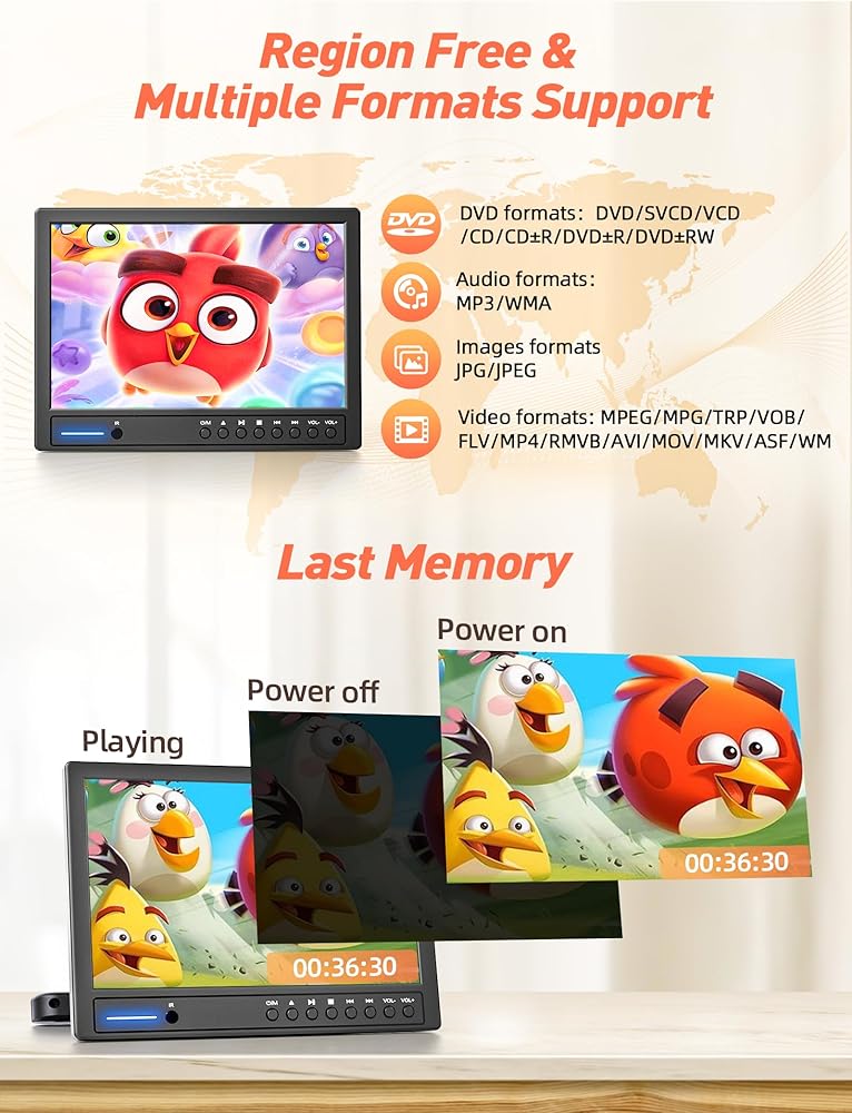 ✨【أقراص تحميل تلقائي 3S وذاكرة أخيرة】أكبر ميزة لمشغل دي في دي المحمول للسيارة هي نوع الشفط التلقائي، ضع القرص في فتحة البطاقة، ويمكن لمحرك الأقراص الضوئية إدخال القرص تلقائيًا. لا حاجة لفتح وإغلاق المشغل طوال الوقت لتغيير الأقراص، وهو مريح جدًا للتشغيل. يمكن لكل من البالغين والأطفال تغيير الأقراص بسهولة. يتميز مشغل دي في دي المحمول بوظيفة الذاكرة الأخيرة. عند تشغيله، فإنه يعمل في المكان الذي توقفت فيه.