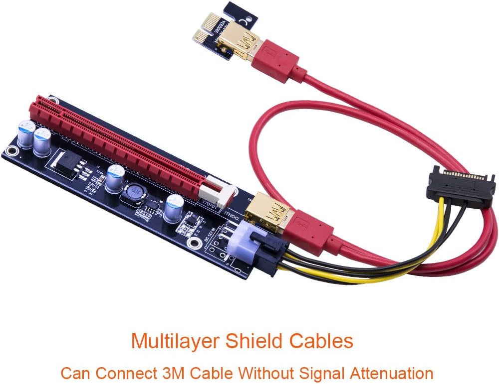 6 عبوات PCIe Riser، وحدة معالجة رسومات PCI-Express ثنائية الشريحة، بطاقة محول Riser تعمل بالطاقة 16X إلى 1X مع كابل تمديد USB 3.0 بطول 60 سم و6 Pin PCI-E إلى كابل الطاقة SATA - تعدين Ethereum ETH