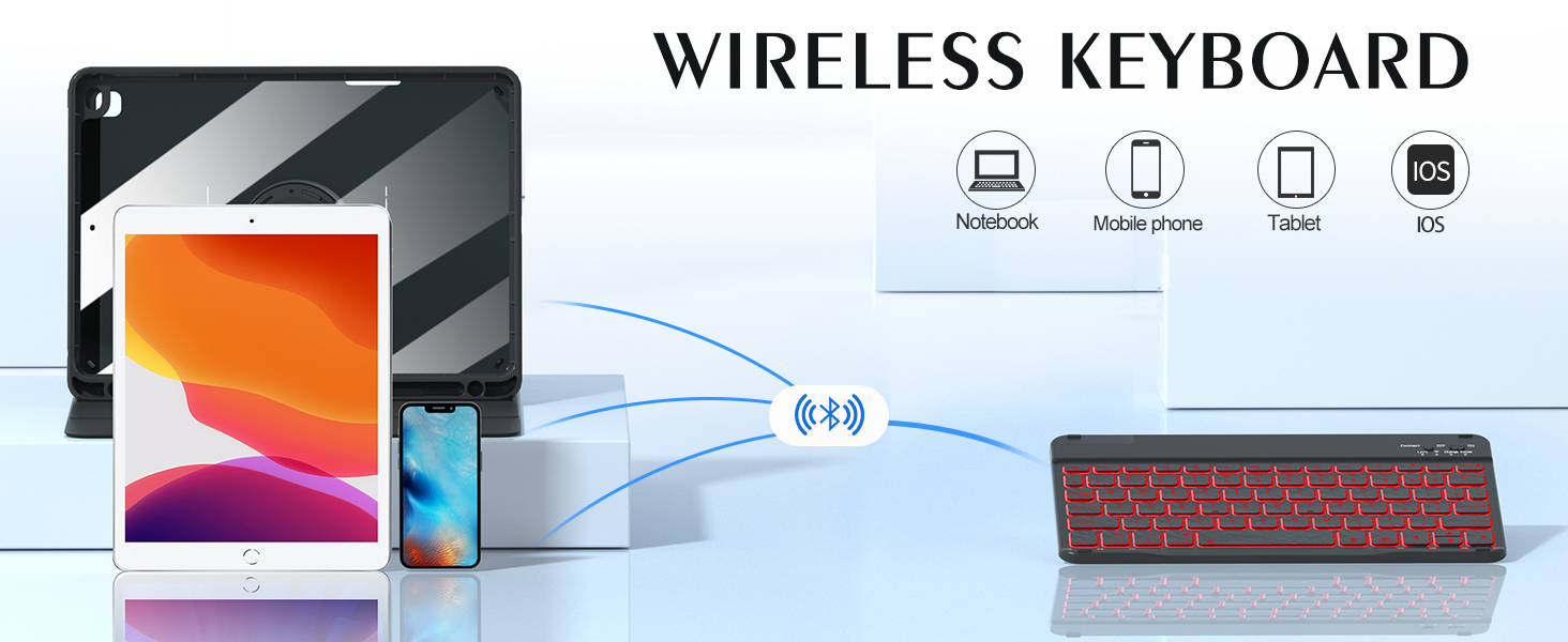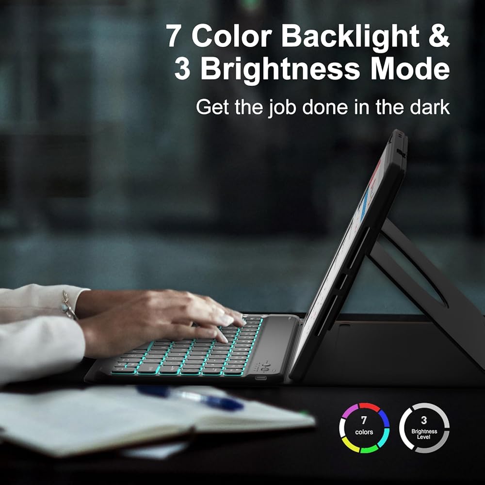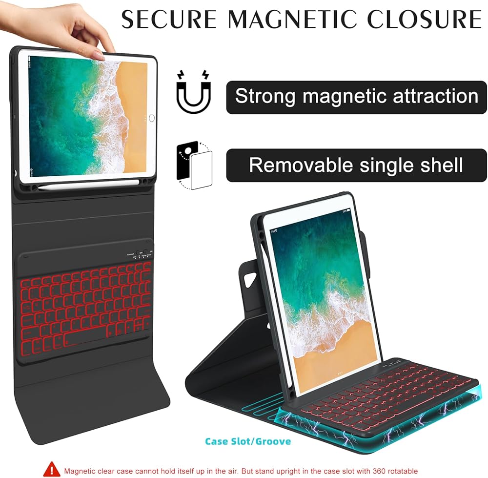 • ✅[لوحة مفاتيح بإضاءة خلفية] لوحة المفاتيح لجهاز iPad 9.7 بوصة والحافظة منفصلة ومرفقة مغناطيسيًا، ويمكن إزالة لوحة المفاتيح من الحافظة. 3 مستويات من السطوع و7 ألوان نابضة بالحياة تجعل الكتابة ممتعة وسهلة في الظلام أو الضوء. يمكن ربط لوحة مفاتيح iPad 9.7 بوصة بالحافظة مغناطيسيًا، وإذا لم تكن هناك حاجة إليها، يمكن إزالتها. اتصال BT سهل التشغيل