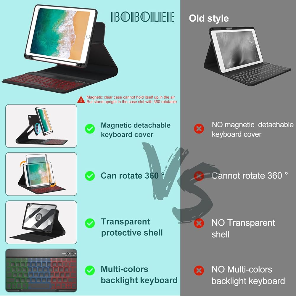 حافظة لوحة مفاتيح BOBOLEE لجهاز iPad الجيل السادس 9.7 بوصة الجيل الخامس، لوحات مفاتيح لجهاز iPad Air 2/Air 1، غطاء نحيف قابل للطي بإضاءة خلفية 360 درجة قابل للفصل مع حامل قلم، أسود
