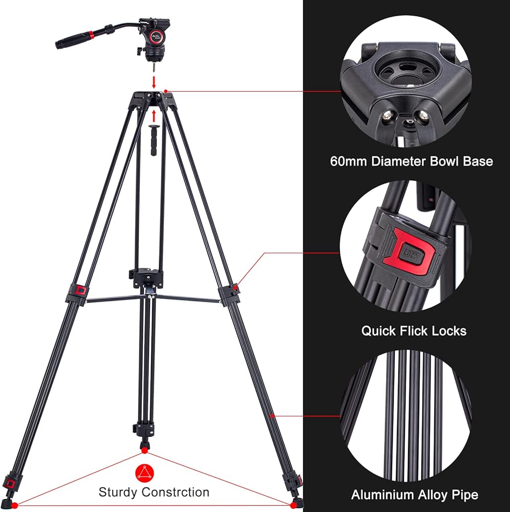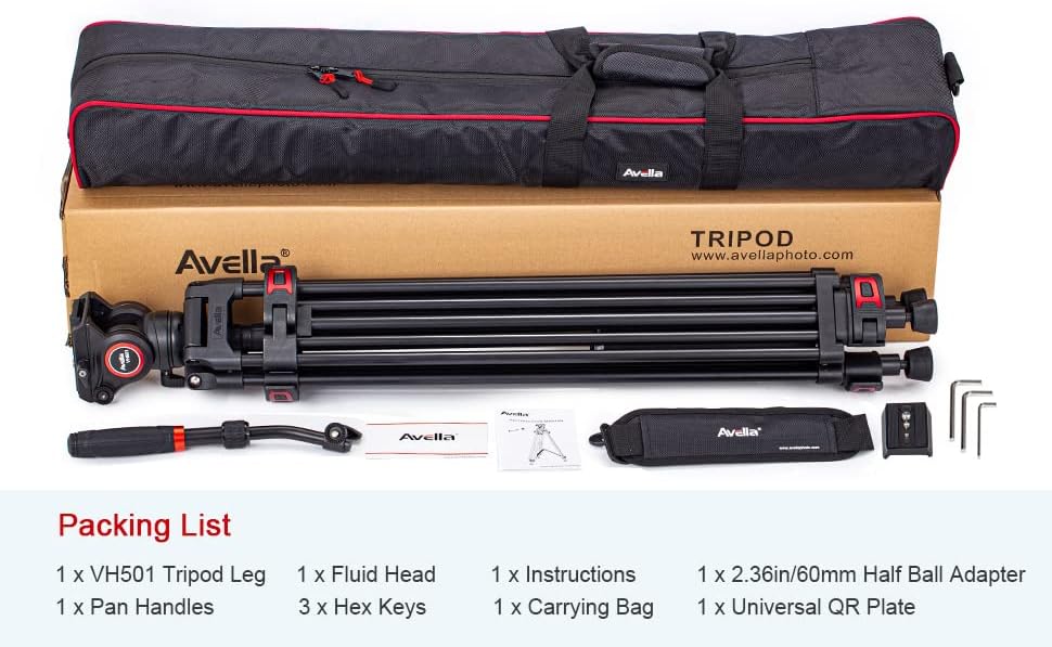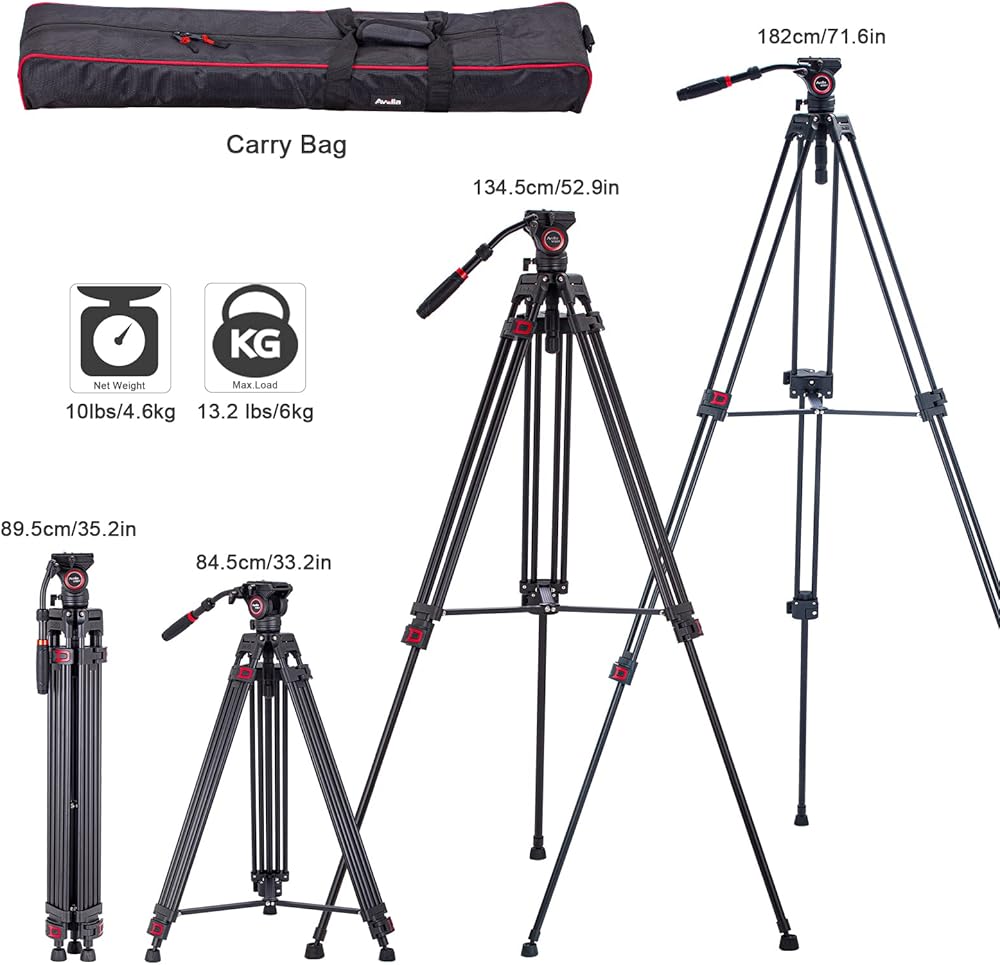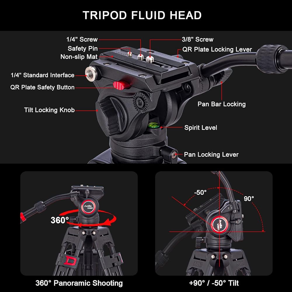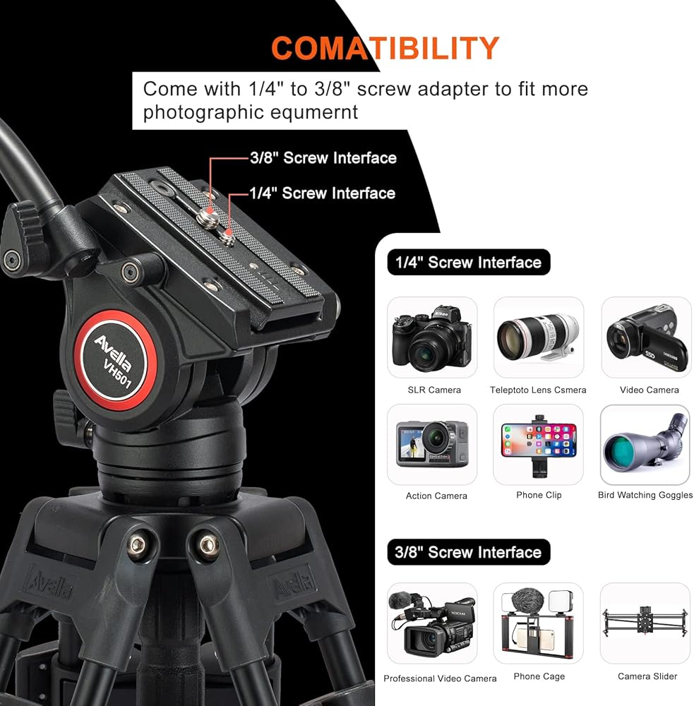 افيلا نظام ثلاثي القوائم للفيديو VH501، حامل ثلاثي القوائم احترافي من الالومنيوم شديد التحمل 72 انش، مع رأس قابل للفصل قابل للفصل وامالة بحد اقصى 13 باوند، لكاميرا كانون ونيكون وسوني واوليمبوس